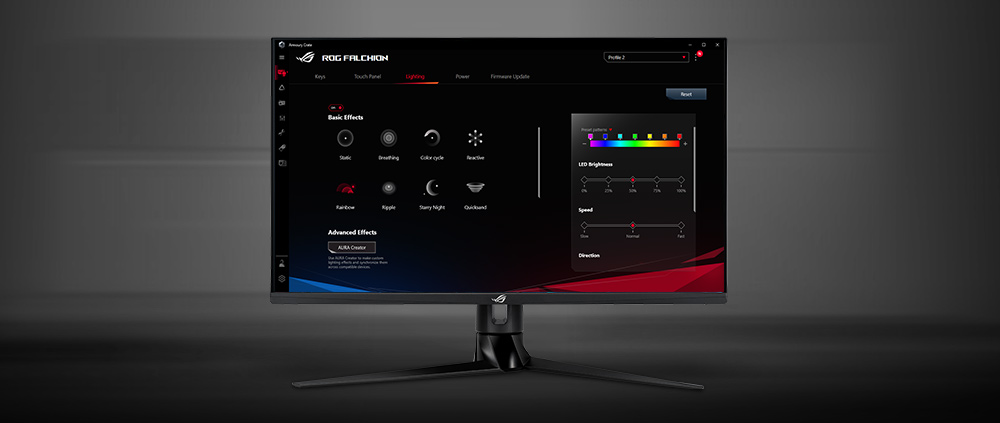 ROG Falchion este o tastatură mecanică wireless în format 65 % proiectată să schimbe modul în care te joci. Are un panou tactil interactiv și un inovator capac cu funcție dublă, fiind prima tastatură ROG cu iluminare RGB Aura Sync wireless. Tastele doubleshot sunt fabricate din materialul rezistent ROG tereftalat de polibutilenă (PBT), iar comutatoarele sunt de fabricație germană, modelul RGB Cherry MX, care permit apăsări precise, cu o senzație tactilă. ROG Falchion utilizează o conexiune radio în gama de frecvențe de 2,4 GHz, din clasa de gaming, cu o rată de raportare de 1 ms și oferă până la 450 de ore de funcționare la un plin de baterie.