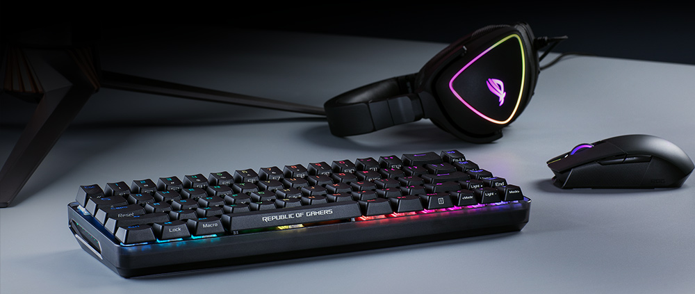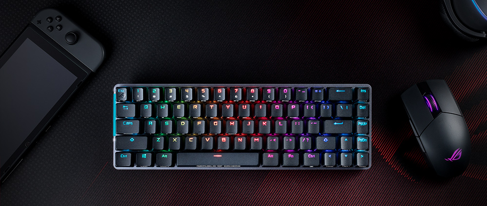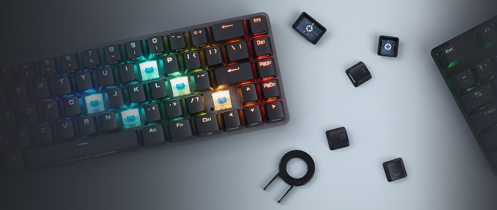 Echipa ROG a intenționat să creeze o tastatură compactă fără compromisuri, încorporând cu măiestrie tatele direcționale și cele de navigație într-un format de tastatură 65%. Iar la o lungime de doar 306 mm, ROG Falchion este aproape la fel de mare ca o tastatură 60%. Oferă toate funcțiile unei tastaturi normale fără să ocupe prea mult spațiu pe birou.