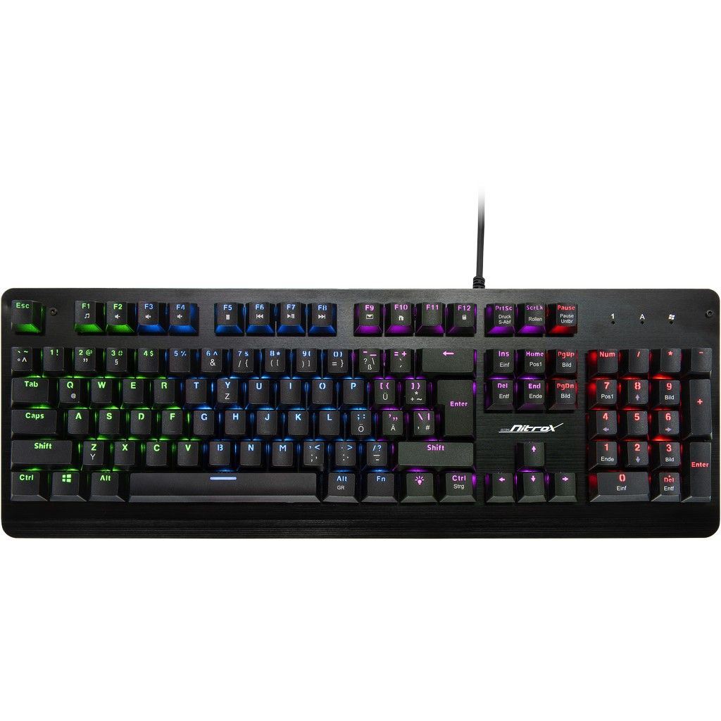 Tastatura gaming mecanica Inter-Tech Nitrox NK-2000ME neagra iluminare RGB, switch-uri albastre Huano, 26 de taste fara conflict (26 n-key rollover), iluminare LED RGB a tastelor, 11 taste multimedia, tasta WIN poate fi dezactivata in timpul jocurilor, carcasa din aluminiu, conector USB, dimensiuni: 442.5x178x38.5 mm.
