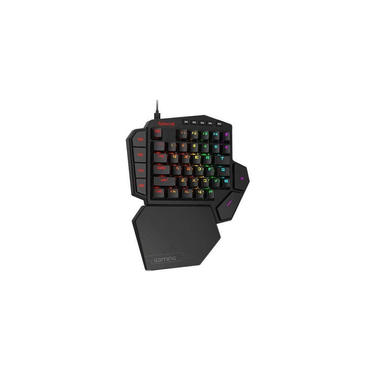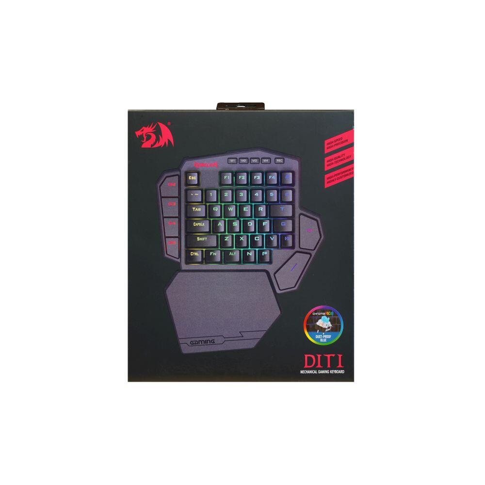 Tastatura gaming mecanica One-hand Redragon Diti neagra iluminare RGB, switch-uri albastre Outemu, sasiu de aluminiu, toate tastele fara conflict (n-key rollover), iluminare LED RGB a tastelor(5 teme de iluminare), 7 taste macro pre-programate, buton dedicat inregistrarii de noi Macro, hub USB cu un port USB 2.0, palmrest magnetic detasabil, lungime cablu: 1.4m, conector USB placat cu aur, USB