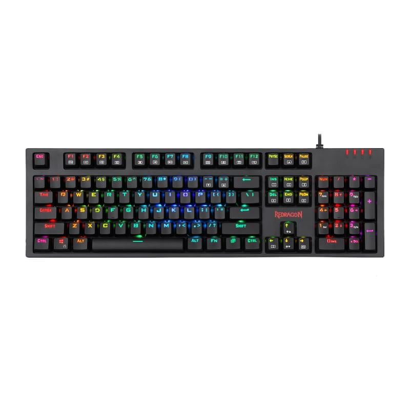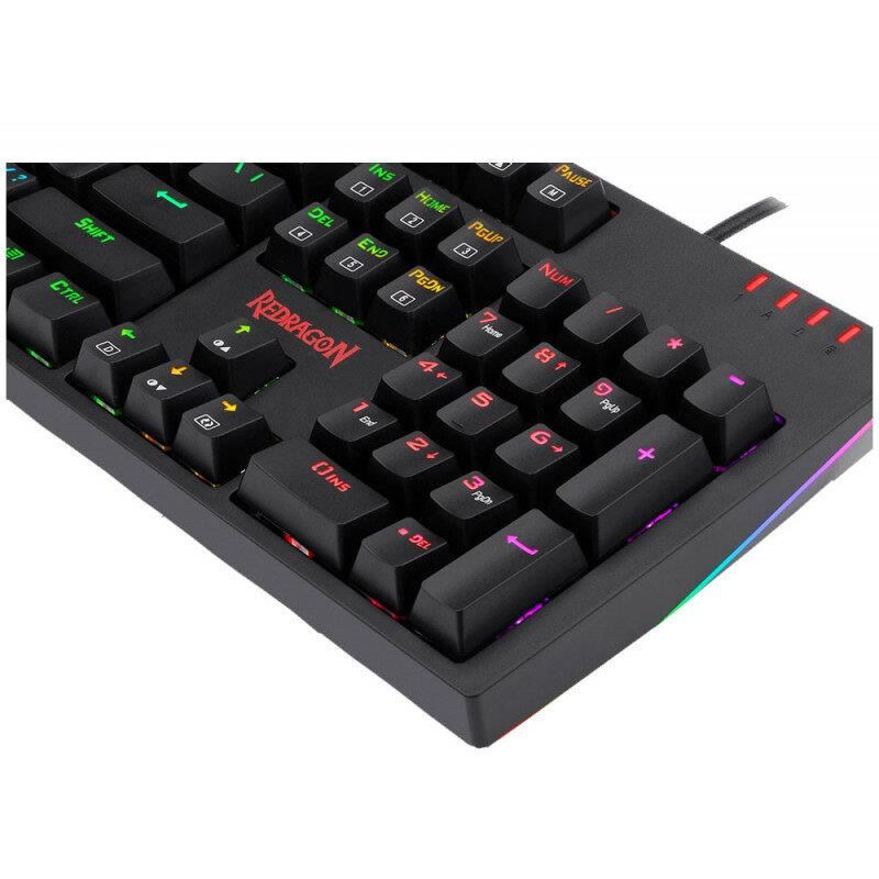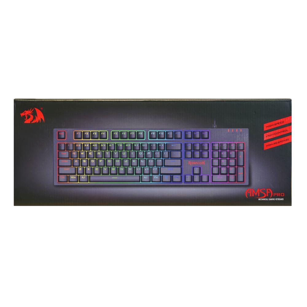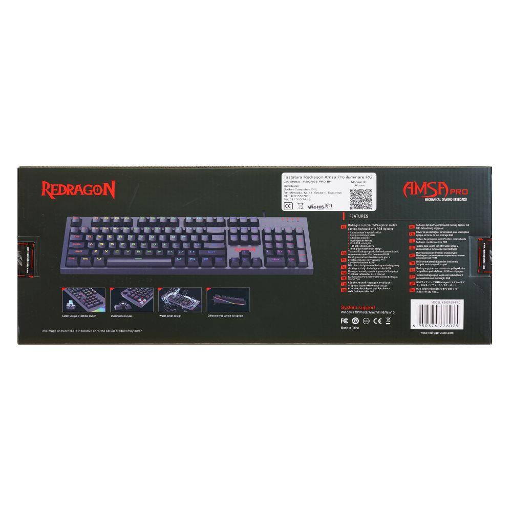 Tastatura gaming mecanica Redragon Amsa Pro iluminare RGB neagra switch-uri albastre, toate tastele fara conflict (n-key rollover), iluminare LED RGB a tastelor (12 moduri de iluminare, reglarea intensitatii), 8 taste multimedia, tasta WIN poate fi dezactivata in timpul jocurilor, 8 switch-uri de schimb, conector USB placat cu aur, USB, dimensiuni: 438x135x48mm