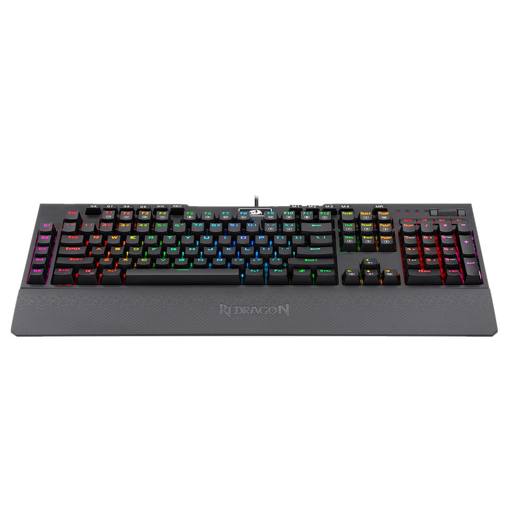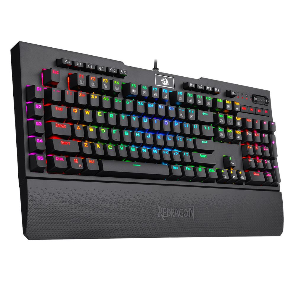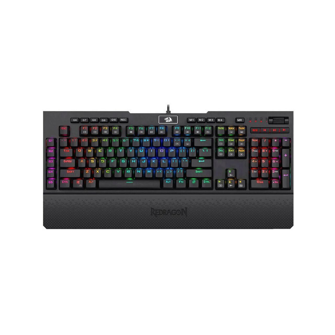 Tastatura gaming mecanica Redragon Brahma neagra iluminare RGB, switch-uri Redragon albastre, toate tastele fara conflict (n-key rollover), iluminare LED RGB a tastelor (16.8 Millioane de culori disponibile, 18 moduri de iluminare, reglarea intensitatii), 12 taste multimedia, 9 taste programabile, tasta WIN poate fi dezactivata in timpul jocurilor, caracterele de pe taste nu se sterg datorita constructiei prin injectie dubla de plastic (double shot injection keycaps), palmrest detasabil, conector: USB, dimensiuni: 467x218x36mm, greutate: 1.5kg