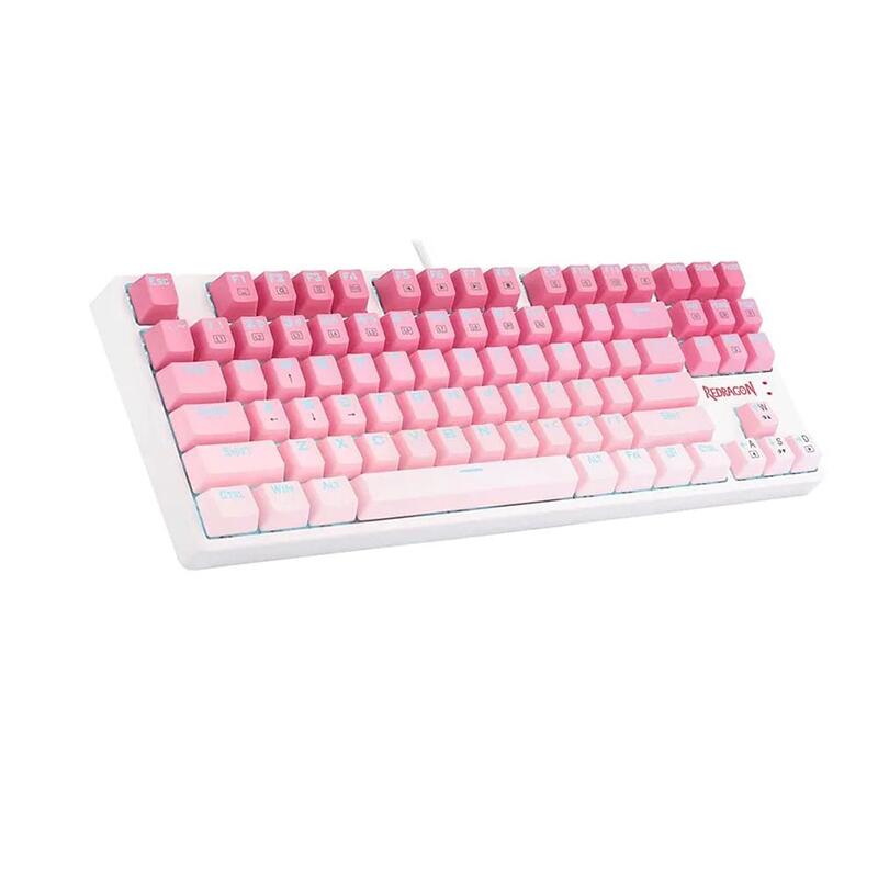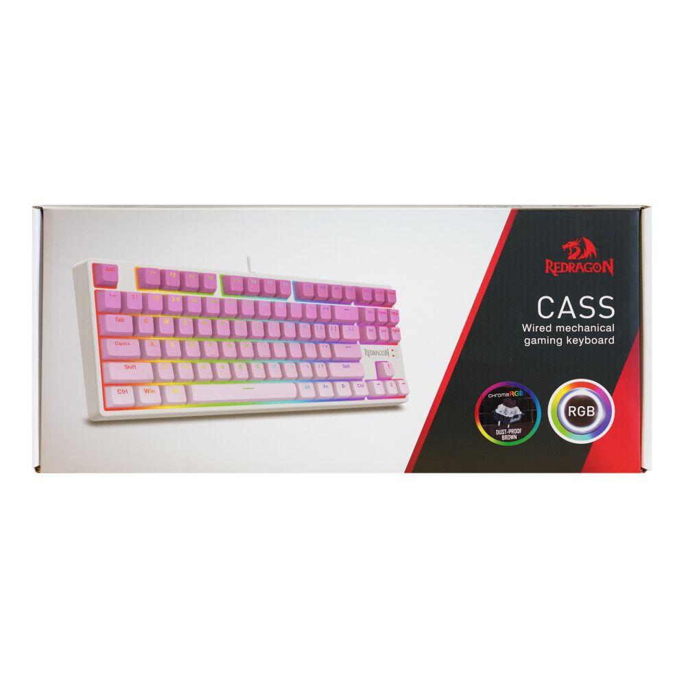 Tastatura gaming mecanica Redragon Cass iluminare RGB alba cu roz, toate tastele fara conflict (n-key rollover), switch-uri maro Redragon, iluminare LED RGB a tastelor (18 moduri de iluminare, reglarea intensitatii), 8 taste multimedia, tasta WIN poate fi dezactivata in timpul jocurilor, conector USB placat cu aur, USB, lungime cablu: 1,8m, dimensiuni: 360x130x36mm, greutate: 901g