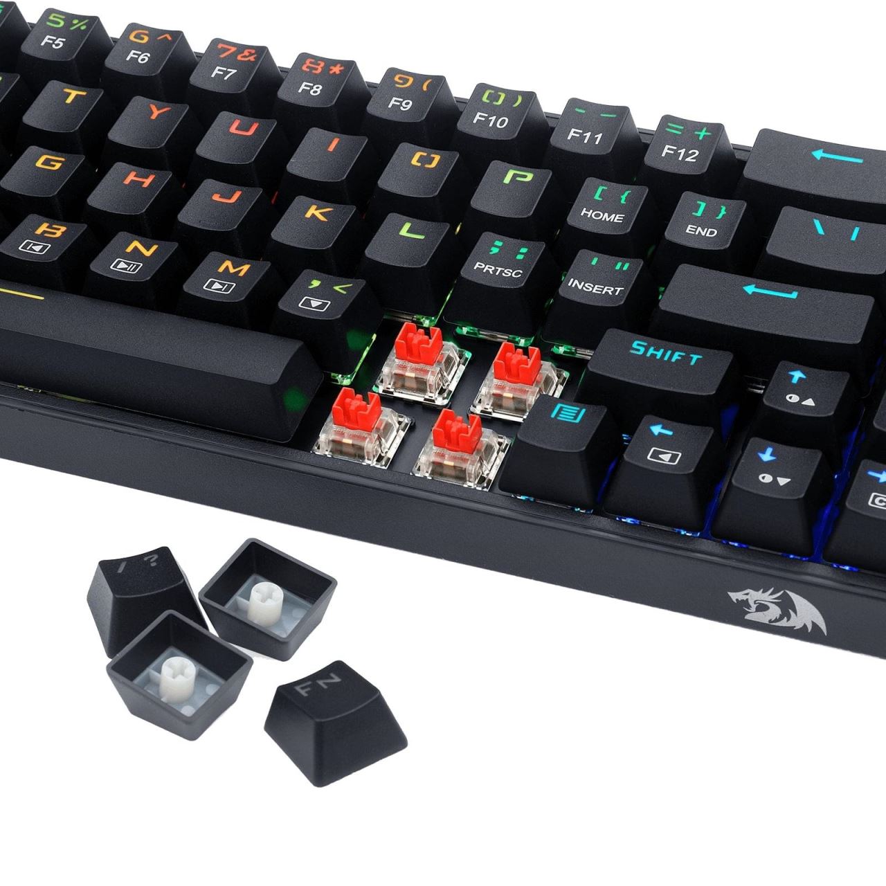 Tastatura gaming mecanica Redragon Castor neagra iluminare RGB switch-uri rosii, switch-uri Redragon rosii, toate tastele fara conflict - 68 taste (n-key rollover), iluminare LED RGB a tastelor (20 moduri de iluminare, reglarea intensitatii), tasta WIN poate fi dezactivata in timpul jocurilor, include switch-uri de schimb, conector USB Type-C, cablu USB detasabil, dimensiuni: 315x106x34mm, greutate: 418g