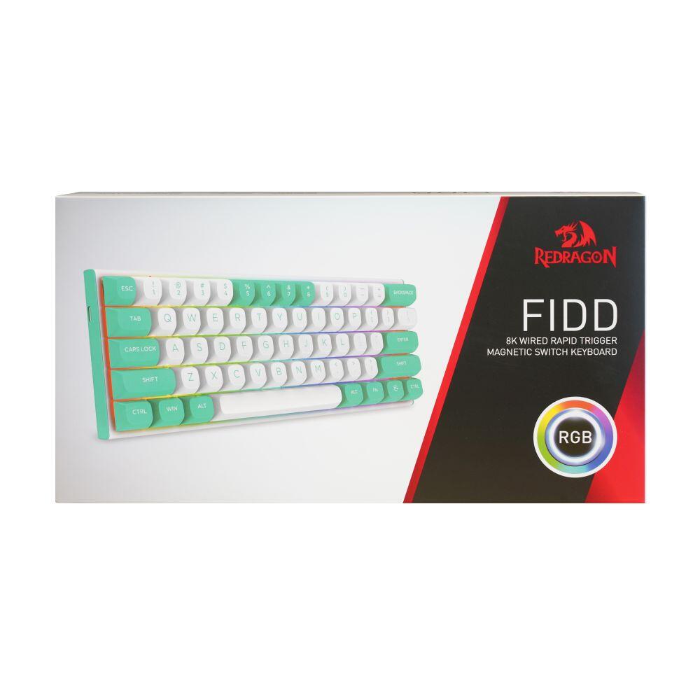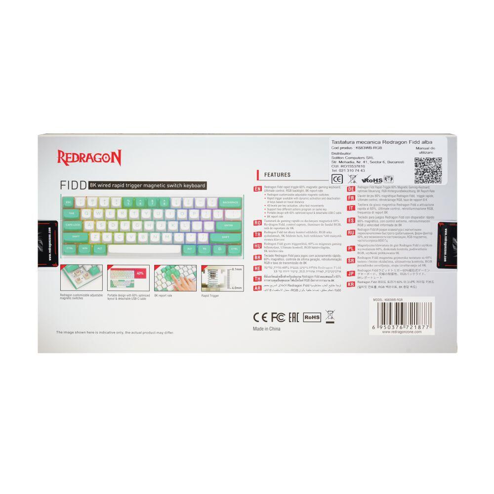 Tastatura gaming mecanica Redragon Fidd alba iluminare RGB switch-uri magnetice roz, toate tastele fara conflict, 61 taste (n-key rollover), switch-uri magnetice roz Redragon (durata de viata: 50 de milioane de apasari), report rate: 8K, include switch-uri de schimb, iluminare LED RGB a tastelor (posibilitatea reglarea intensitatii luminoase, 14 moduri de iluminare), tasta WIN poate fi dezactivata in timpul jocurilor, caracterele de pe taste nu se sterg datorita constructiei prin injectie dubla de plastic (double shot injection keycaps), cablu detasabil, conector USB Type-C, dimensiuni: 291x104x34mm, greutate: 565g
