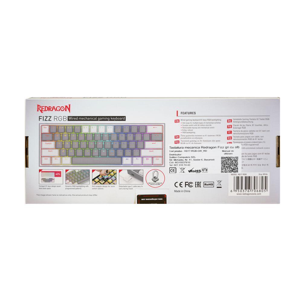 Tastatura gaming mecanica Redragon Fizz gri cu alb iluminare RGB switch-uri rosii, toate tastele fara conflict, 61 taste (n-key rollover), switch-uri rosii Redragon (durata de viata: 50 de milioane de apasari), 4 switch-uri de schimb, iluminare LED RGB a tastelor (posibilitatea reglarea intensitatii luminoase, 13 moduri de iluminare), tasta WIN poate fi dezactivata in timpul jocurilor, caracterele de pe taste nu se sterg datorita constructiei prin injectie dubla de plastic (double shot injection keycaps), cablu detasabil, conector USB Type-C, dimensiuni: 296x105x45mm, greutate: 412g