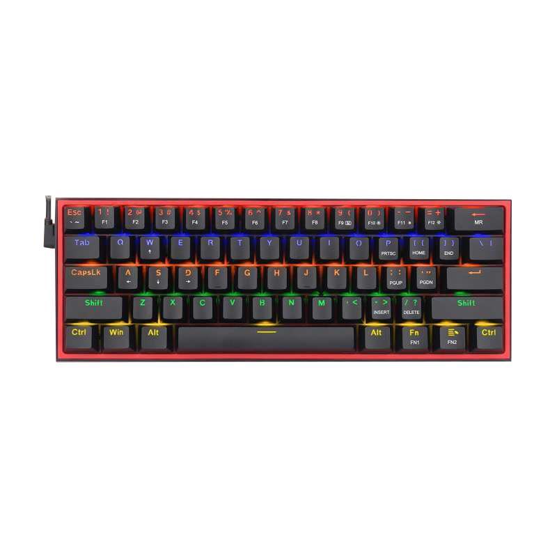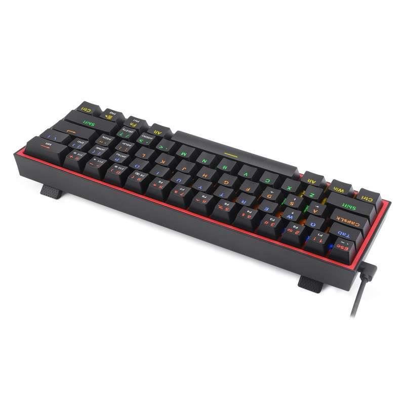 Tastatura gaming mecanica Redragon Fizz neagra iluminare Rainbow switch-uri albastre, toate tastele fara conflict, 61 taste (n-key rollover), switch-uri albastre Redragon (durata de viata: 50 de milioane de apasari), 4 switch-uri albastre de schimb, iluminare LED RGB a tastelor (posibilitatea reglarea intensitatii luminoase, 13 moduri de iluminare), tasta WIN poate fi dezactivata in timpul jocurilor, caracterele de pe taste nu se sterg datorita constructiei prin injectie dubla de plastic (double shot injection keycaps), cablu detasabil, conector USB Type-C, dimensiuni: 296x105x45mm