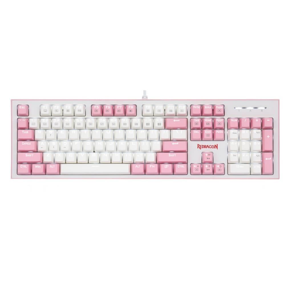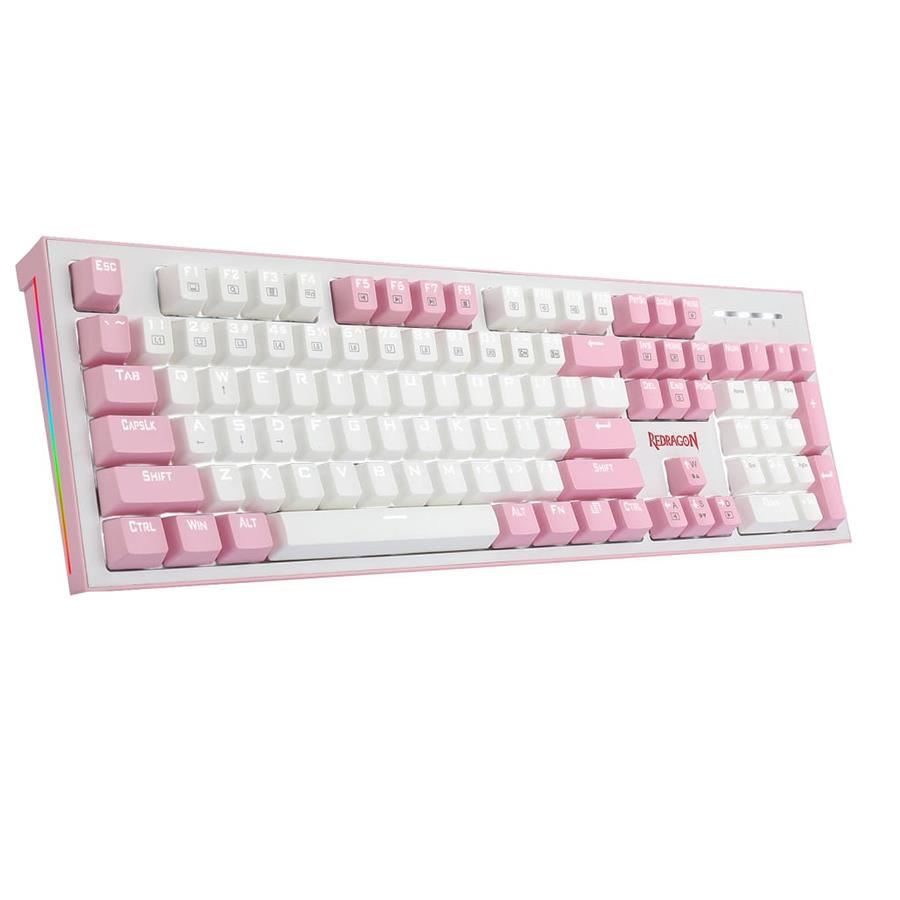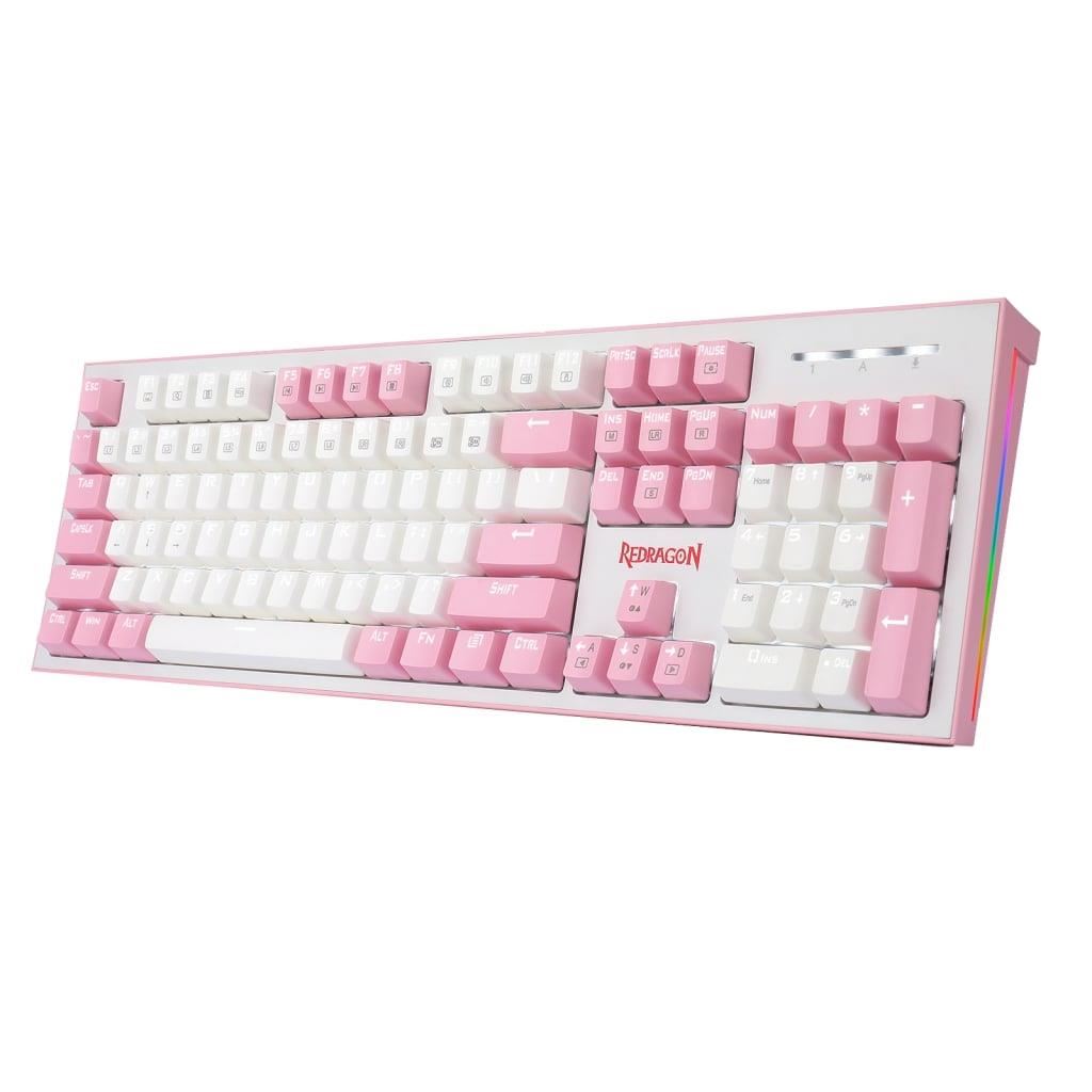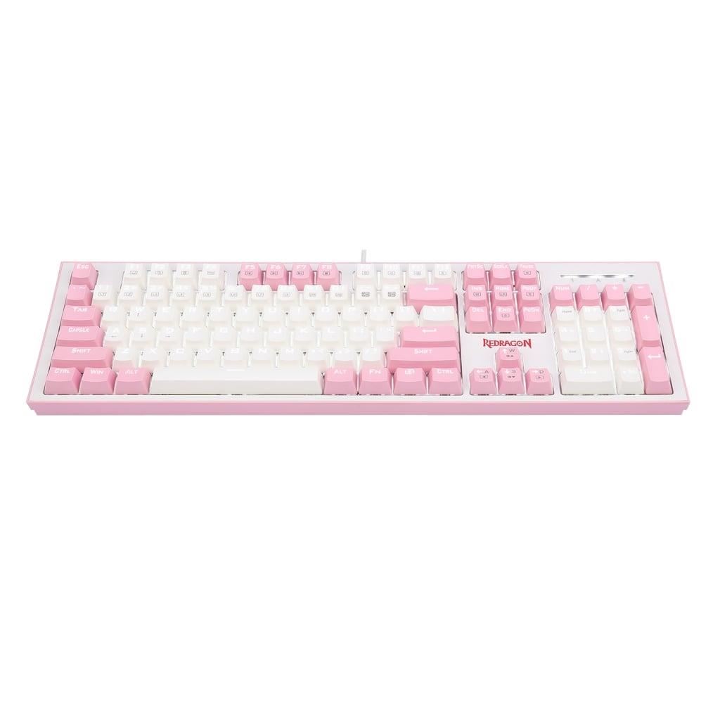 Tastatura gaming mecanica Redragon Hades alba cu roz iluminare alba switch-uri albastre, toate tastele fara conflict (n-key rollover), switch-uri albastre, iluminare LED alba a tastelor (9 moduri de iluminare, reglarea intensitatii), 8 taste multimedia, 9 moduri de joc programate (se acceseaza folosind combinatia de taste “FN” si tastele de la 1 la 9), tasta WIN poate fi dezactivata in timpul jocurilor, conector USB placat cu aur, USB, dimensiuni: 449x134x34mm, greutate: 833g