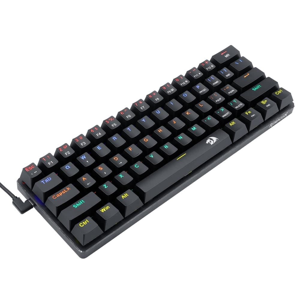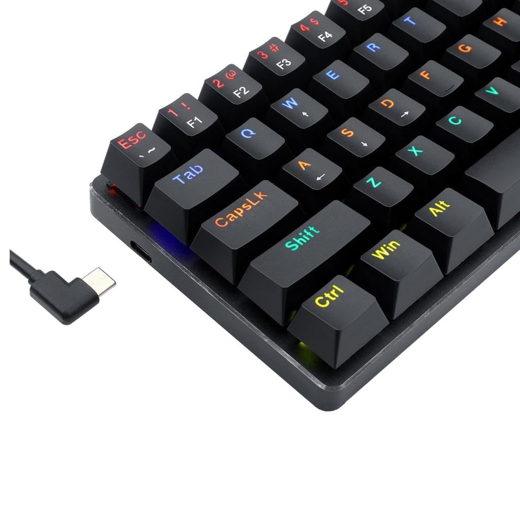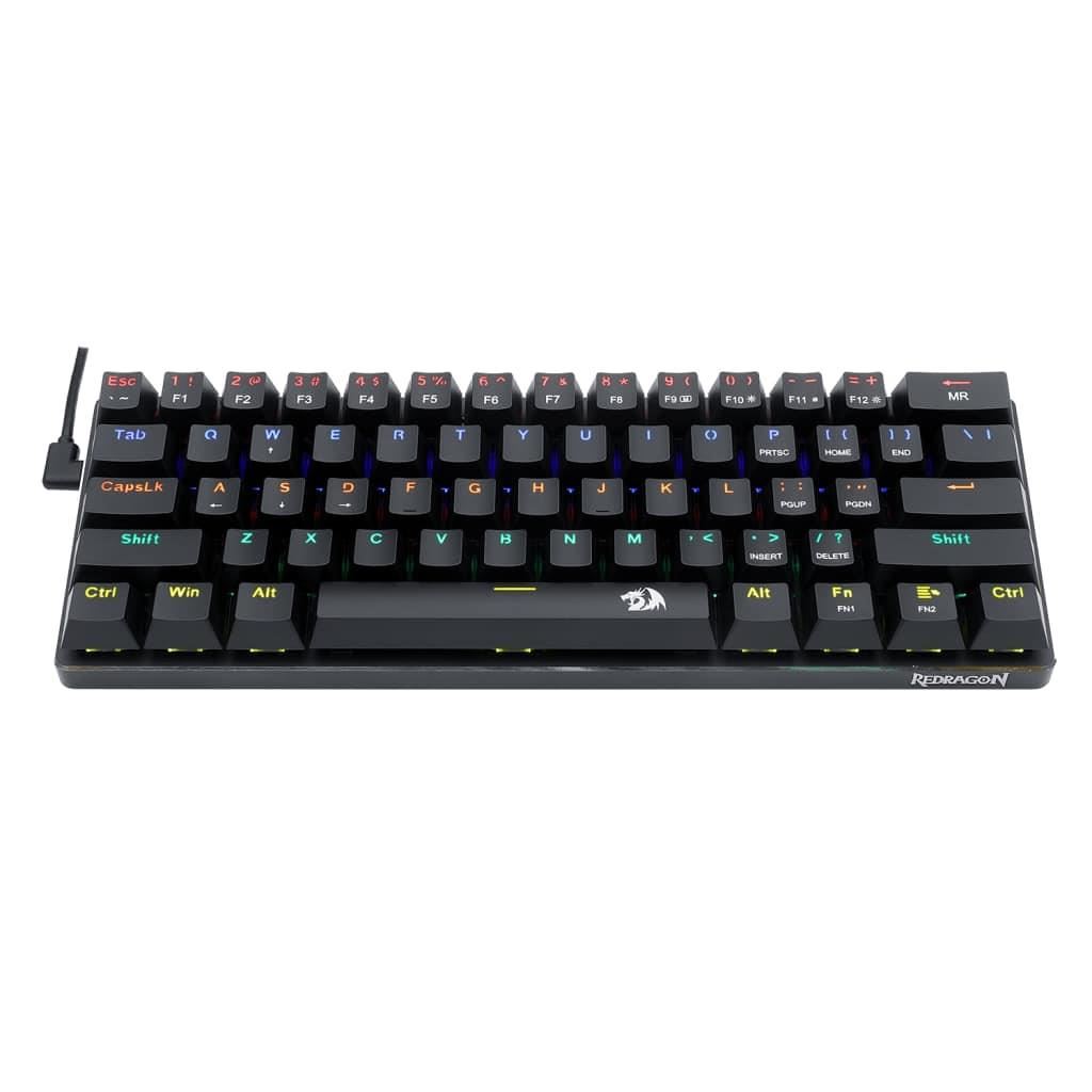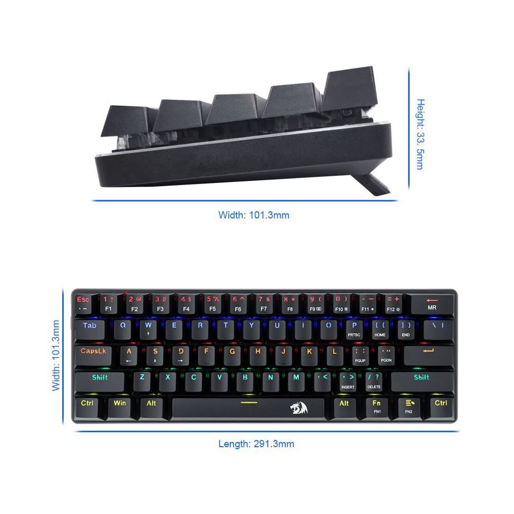 Tastatura gaming mecanica Redragon Jax neagra iluminare Rainbow switch-uri albastre, toate tastele fara conflict, 61 taste (n-key rollover), switch-uri albastre Redragon (durata de viata: 50 de milioane de apasari), iluminare LED RGB a tastelor (posibilitatea reglarea intensitatii luminoase, 17 moduri de iluminare), tasta WIN poate fi dezactivata in timpul jocurilor, caracterele de pe taste nu se sterg datorita constructiei prin injectie dubla de plastic (double shot injection keycaps), cablu detasabil, conector USB Type-C, dimensiuni: 291x102x34mm, greutate: 461g