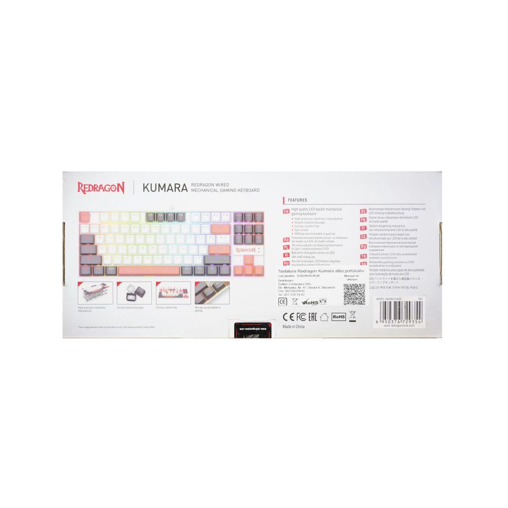 Tastatura gaming mecanica Redragon Kumara alba cu gri si portocaliu iluminare RGB switch-uri rosii, toate tastele fara conflict - 87 taste (n-key rollover), iluminare LED RGB a tastelor (reglarea intensitatii, 18 efecte de iluminare), 8 taste multimedia, tasta WIN poate fi dezactivata in timpul jocurilor, caracterele de pe taste nu se sterg datorita constructiei prin injectie dubla de plastic (double shot injection keycaps), conector USB, dimensiuni: 354x124x37mm, greutate: 851g