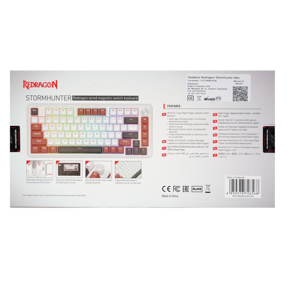 Tastatura gaming mecanica Redragon Stormhunter alba iluminare RGB, switch-urimagnetice Redragon roz, keycaps-uri din PBT, toate tastele fara conflict – 81 taste (n-key rollover), iluminare LED RGB a tastelor (20 moduri de iluminare, reglarea intensitatii), display TFT 1.41 inch customizabil, rotita pentru reglarea volumului si a luminozitatii, PO Silencer Foam instalata in interiorul tastaturii, gasket din silicon, tasta WIN poate fi dezactivata in timpul jocurilor, 6 taste multimedia, include switch-uri de schimb, compatibila cu majoritatea switch-urilor, conector USB Type-C, cablu USB detasabil (cablu cu conectori USB Type-C si adaptor pentru USB Type A), dimensiuni: 334x140x43mm, greutate: 1.8Kg