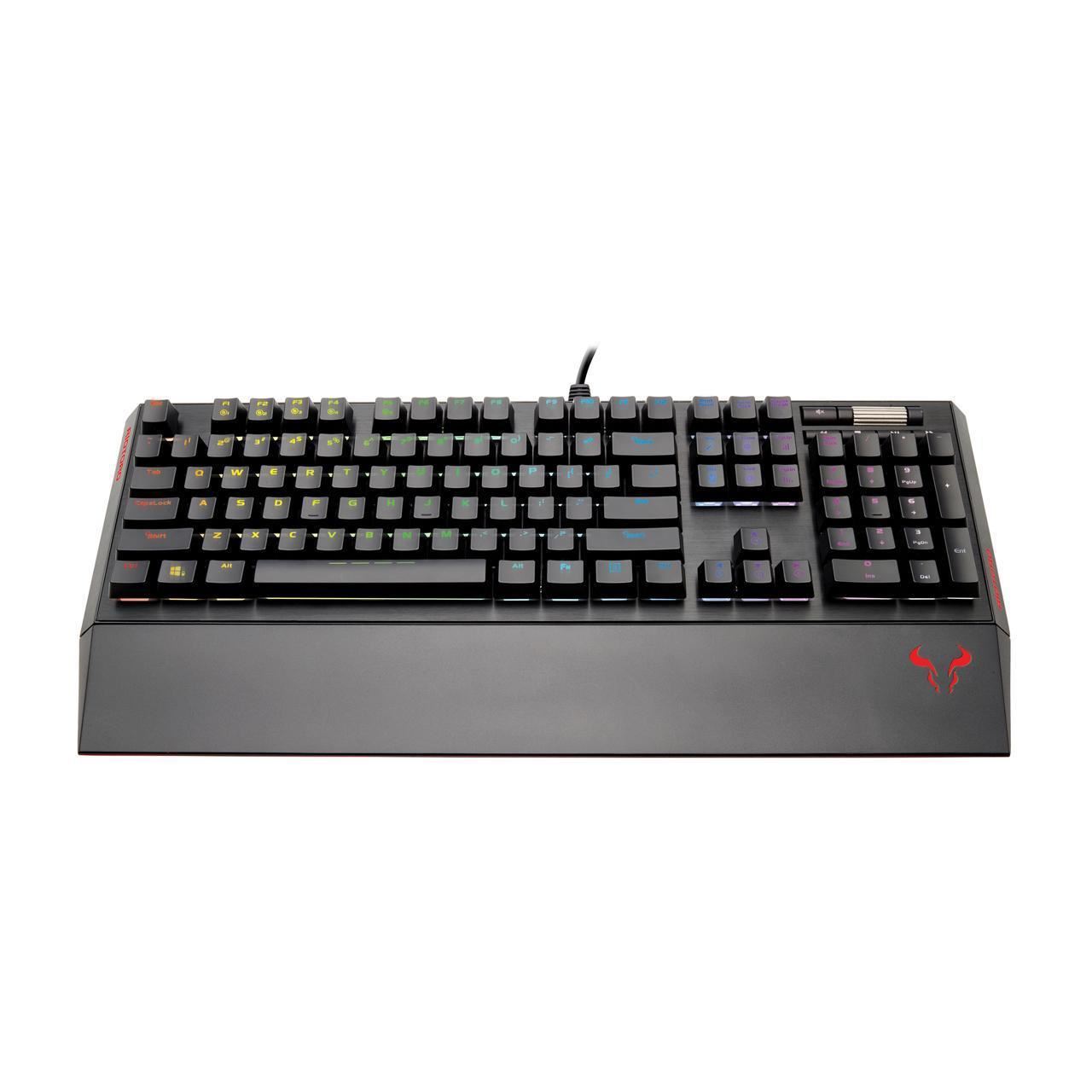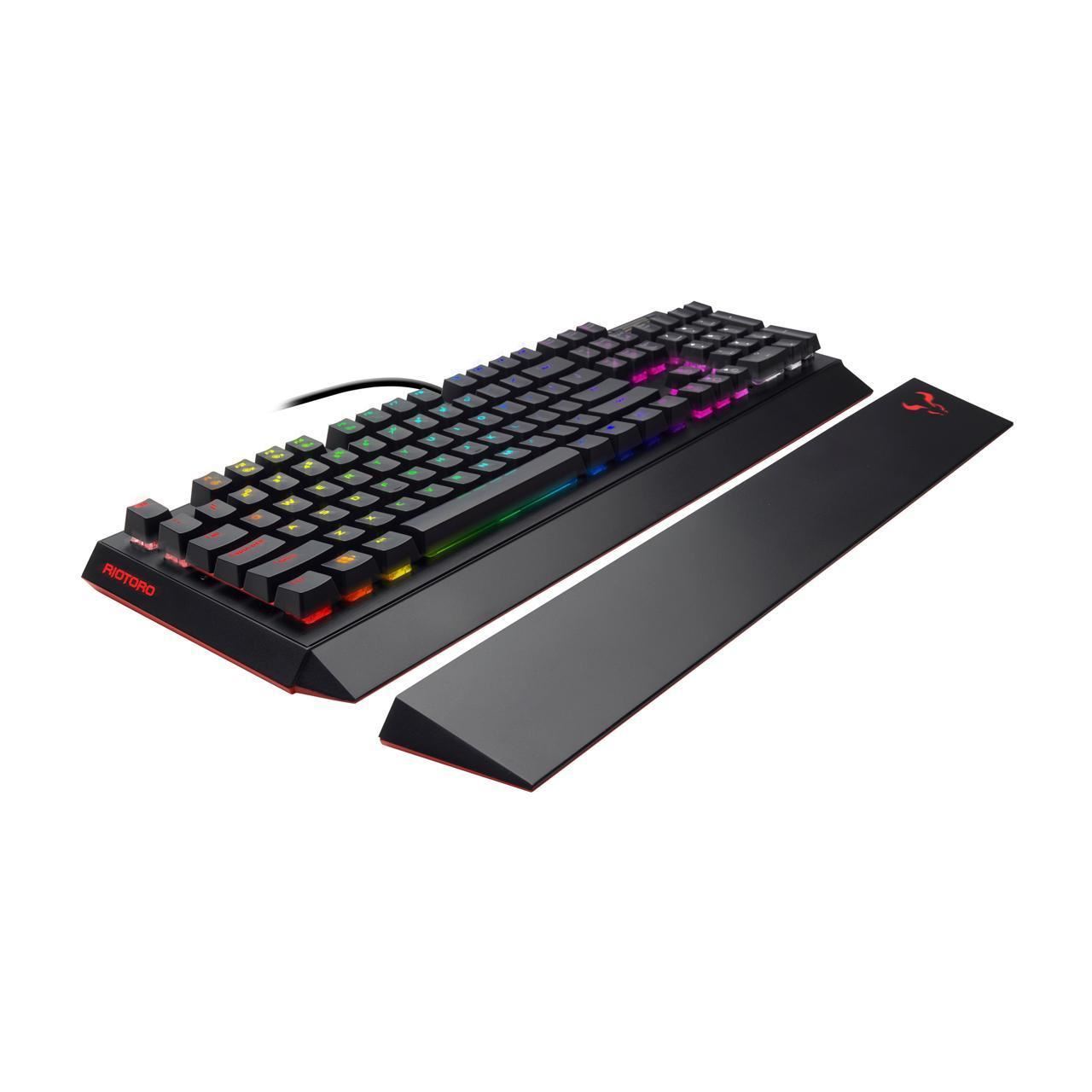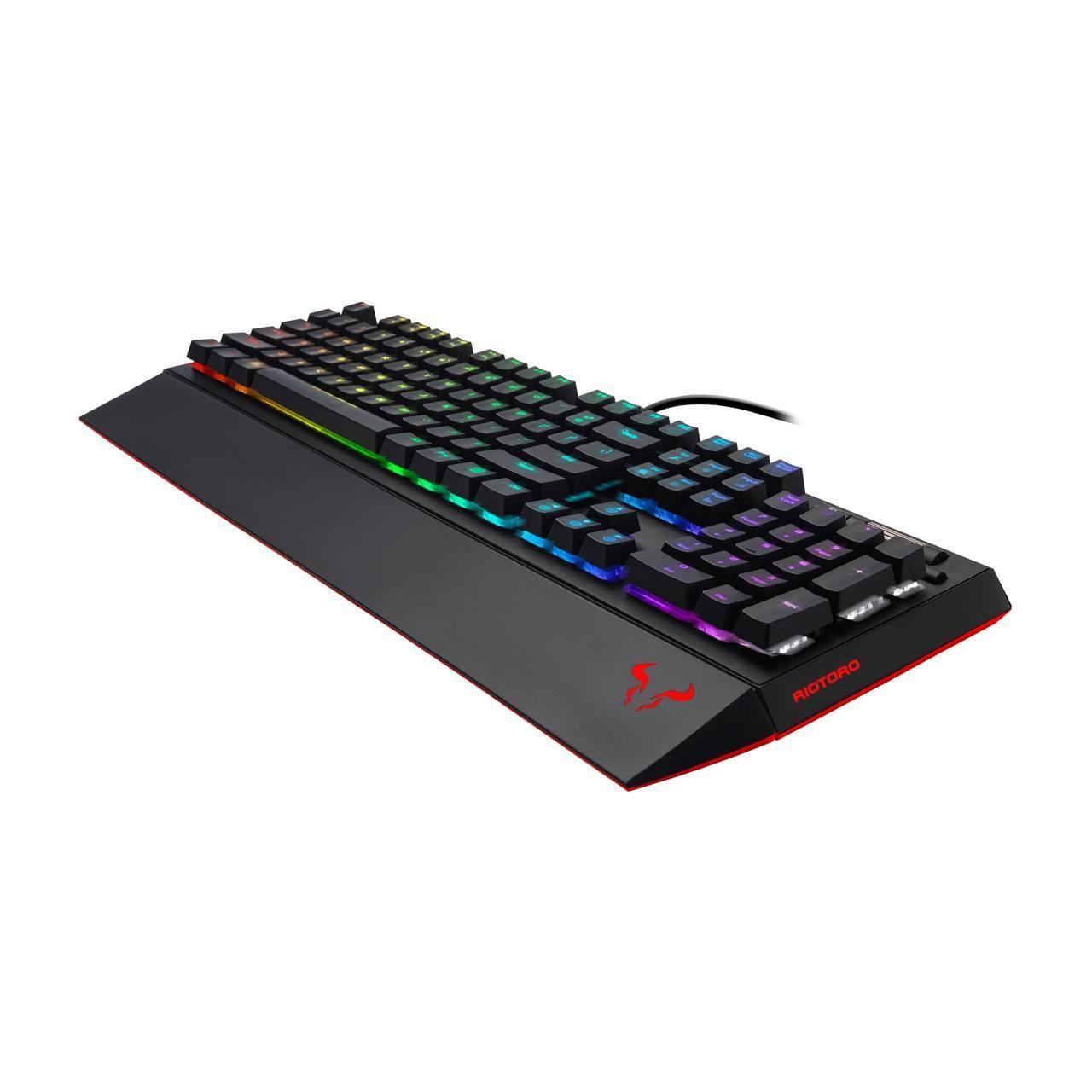 Tastatura gaming mecanica Riotoro Ghostwriter Prism Cherry MX Black neagra iluminare RGB, switch-uri Cherry MX Black, sasiu de aluminiu, toate tastele fara conflict (n-key rollover), iluminare LED RGB a tastelor(10 jocuri de iluminare, diferite nivele de intensitate), 6 taste multimedia, palmrest detasabil, software ce permite diferite configurari, HUB USB integrat cu 2 port-uri, conector 2x USB, dimensiuni: 463.5x211.6x30.2mm, greutate: 0.9kg