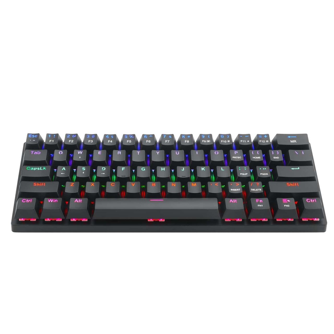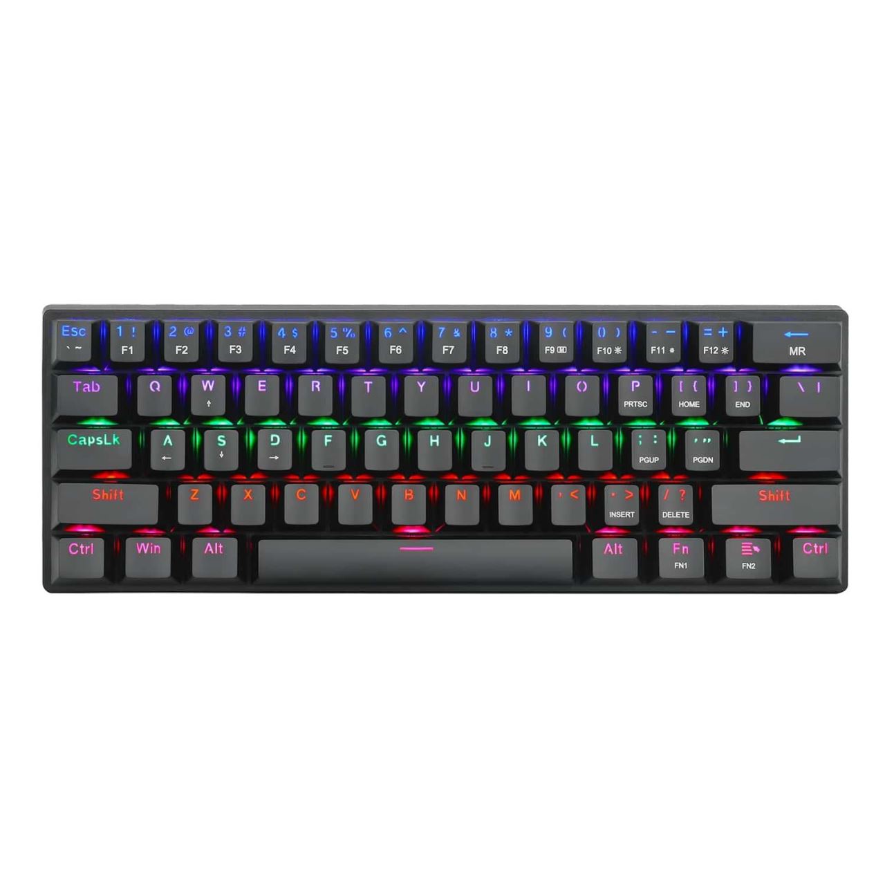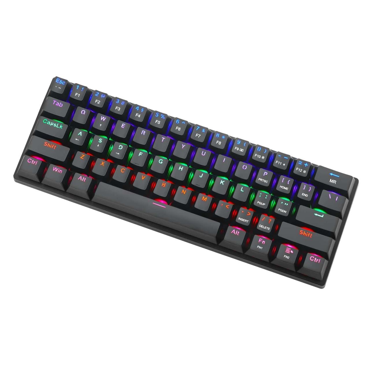 Tastatura gaming mecanica T-Dagger Arena neagra, switch-uri ET-7 albastre, toate tastele fara conflict - 61 taste (n-key rollover), iluminare LED RGB a tastelor (13 moduri de iluminare, reglarea intensitatii), functie de inregistrare macro on-the-fly, tasta WIN poate fi dezactivata in timpul jocurilor, conector USB Type-C, cablu USB detasabil, dimensiuni: 292x102x36mm, greutate: 0.7kg