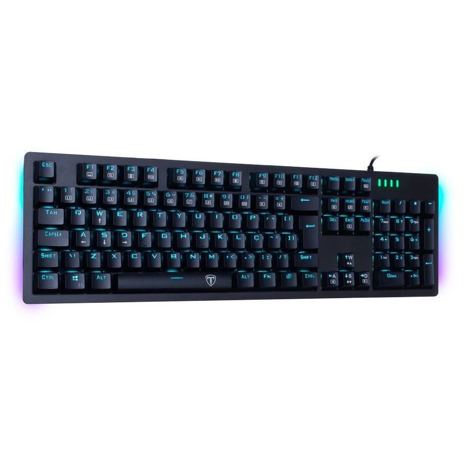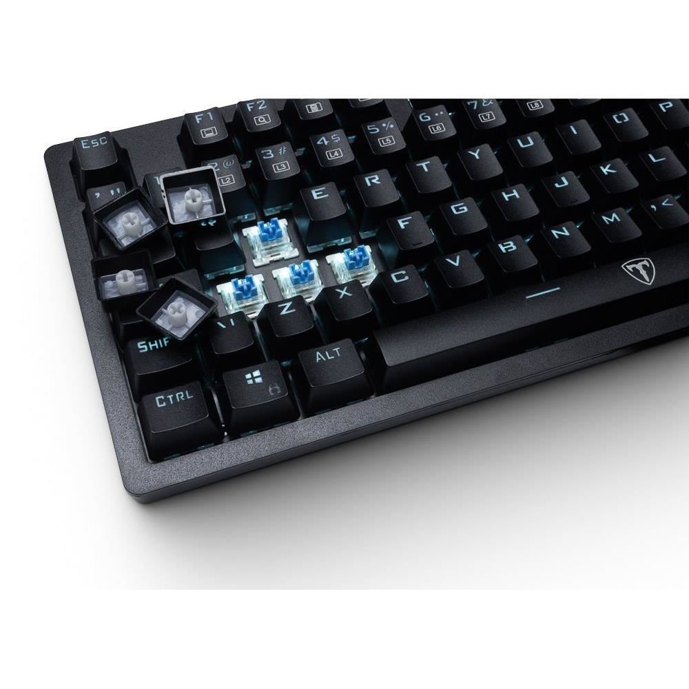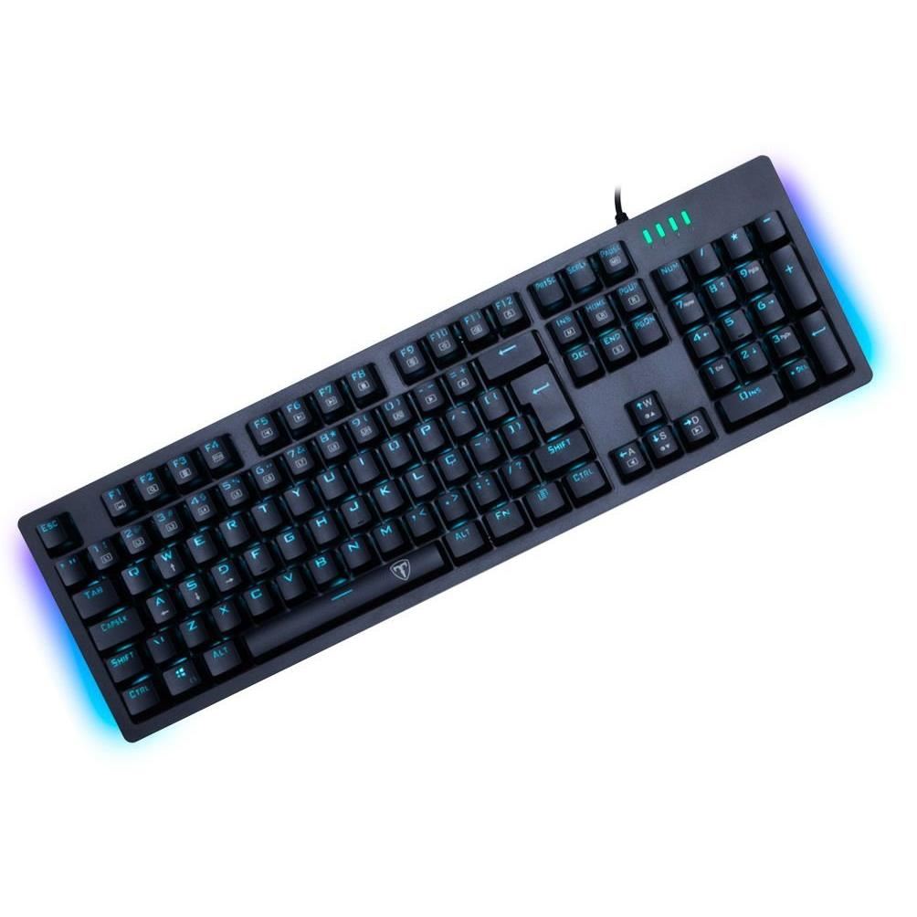 Tastatura gaming mecanicaT-Dagger Bermuda neagra iluminare Ice-Blue switch-uri albastre, toate tastele fara conflict (n-key rollover), switch-uri albastre Outemu, iluminare LED Ice Blue (diferite moduri de iluminare, reglarea intensitatii), lateralele tastaturii sunt iluminate RGB, 8 taste multimedia, tasta WIN poate fi dezactivata in timpul jocurilor, taste durabile (double shot inject), conector USB, dimensiuni: 444x134x48mm