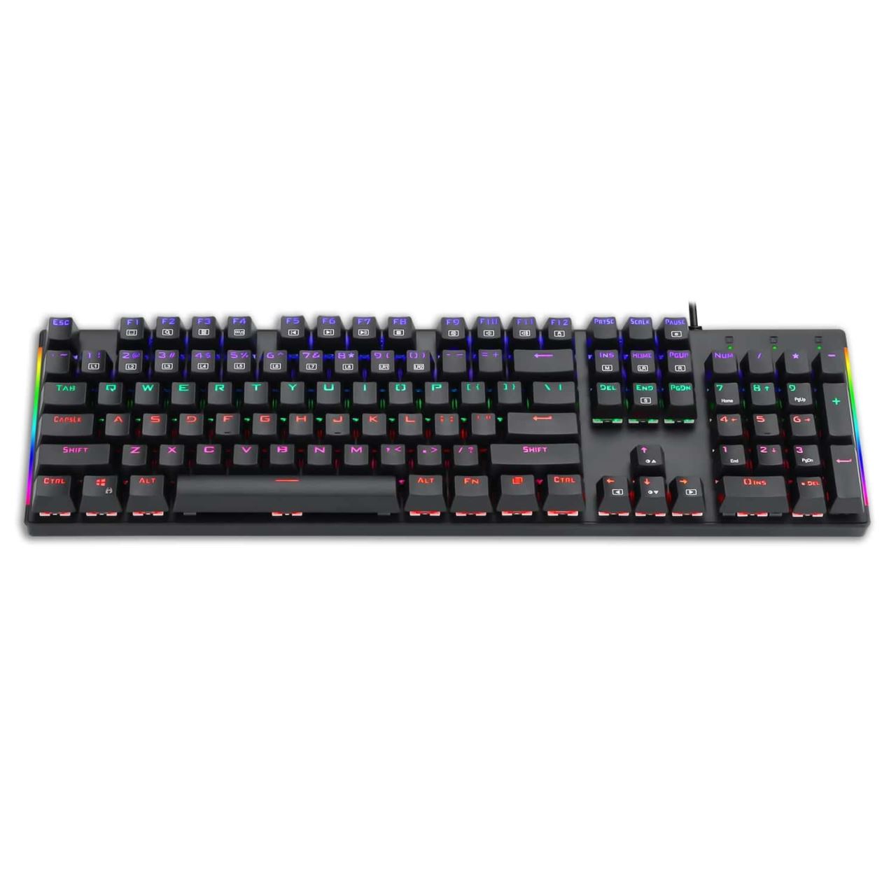 Tastatura gaming mecanica T-Dagger Naxos iluminare rainbow neagra, switch-uri albastre Outemu, durata de viata 50 milioane de apasari, iluminare LED rainbow, toate tastele fara conflict (n-key rollover), 2 benzi LED RGB pe laterale, 7 taste multimedia, tasta WIN poate fi dezactivata in timpul jocurilor, taste durabile (double shot inject), conector USB placat cu aur, dimensiuni:436x125x40mm