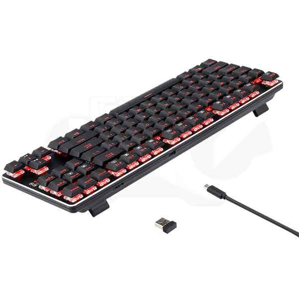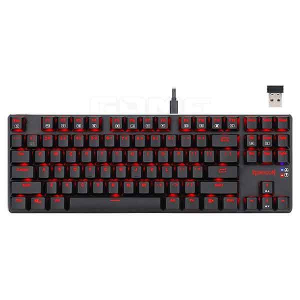 Tastatura gaming mecanica wireless Redragon Mahoraga neagra iluminare rosie switch-uri rosii, toate tastele fara conflict (n-key rollover), taste low-profile, iluminare LED rosie a tastelor si a lateralelor (reglarea intensitatii), 8 taste multimedia, tasta WIN poate fi dezactivata in timpul jocurilor, tastatura poate fi folosita cu sau fara fir, locas magnetic pentru dongle-ul USB, conector USB pentru dongle si MicroUSB pentru cablu placat cu aur, USB, dimensiuni: 355x123x40mm
