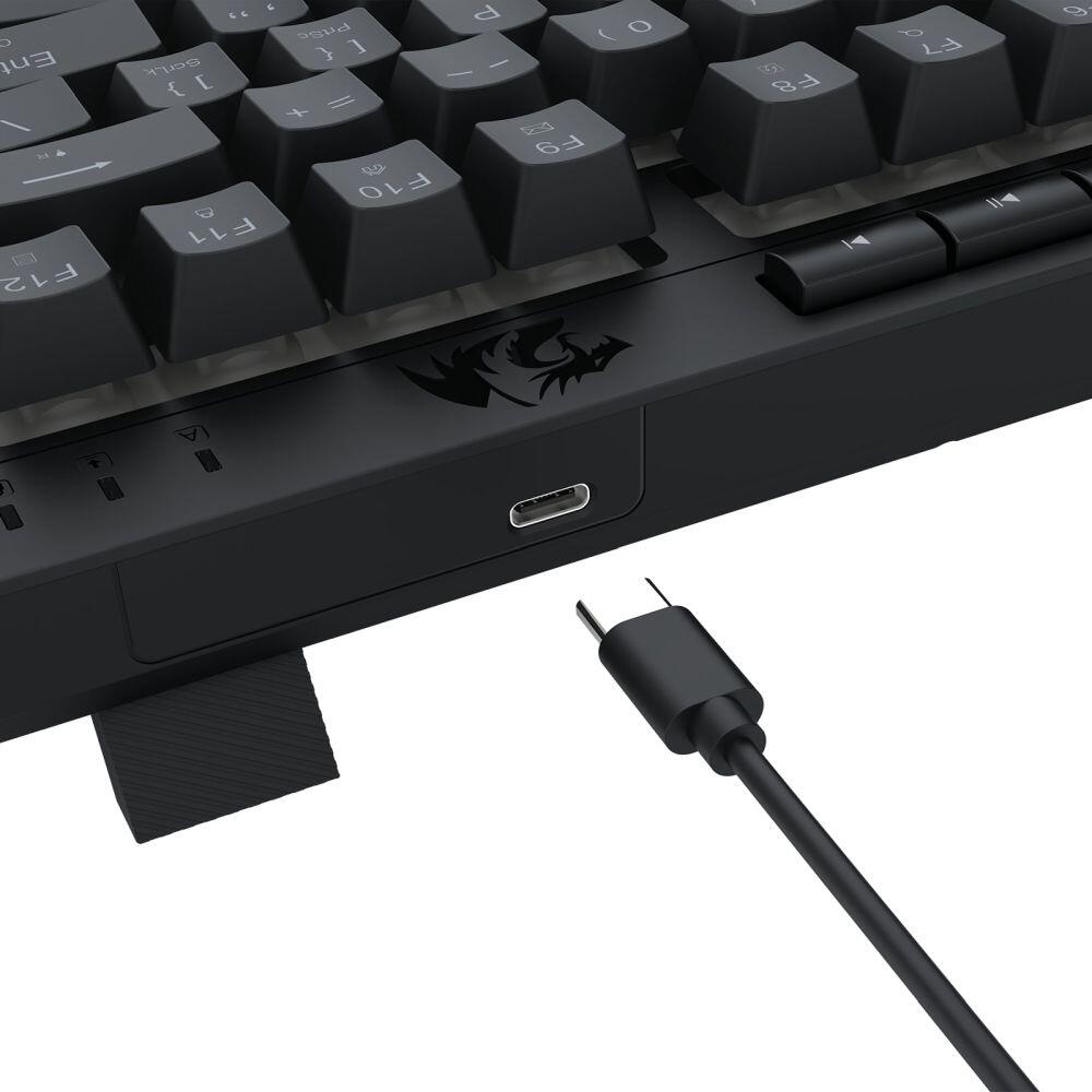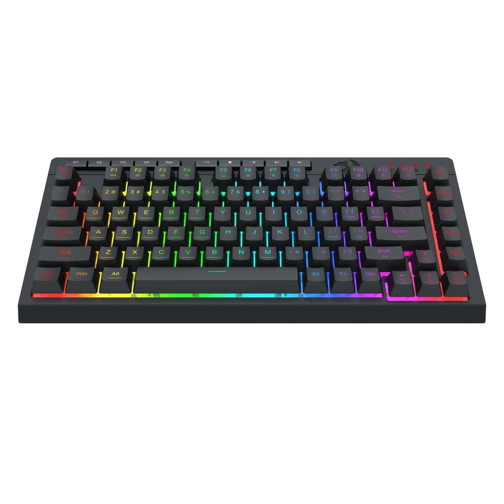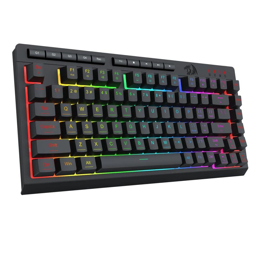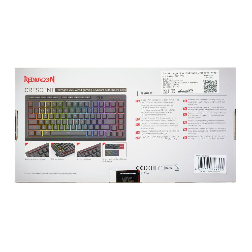 Tastatura gaming Redragon Crescent neagra iluminare RGB, 82 de taste, 26 taste fara conflict (26-key rollover), iluminare LED RGB a tastelor, 5 taste multimedia, 4 taste MACRO, tasta WIN poate fi dezactivata in timpul jocurilor, soft de configurare al tastaturii, conector USB, dimensiuni: 326x156x38mm, greutate: 0.48kg