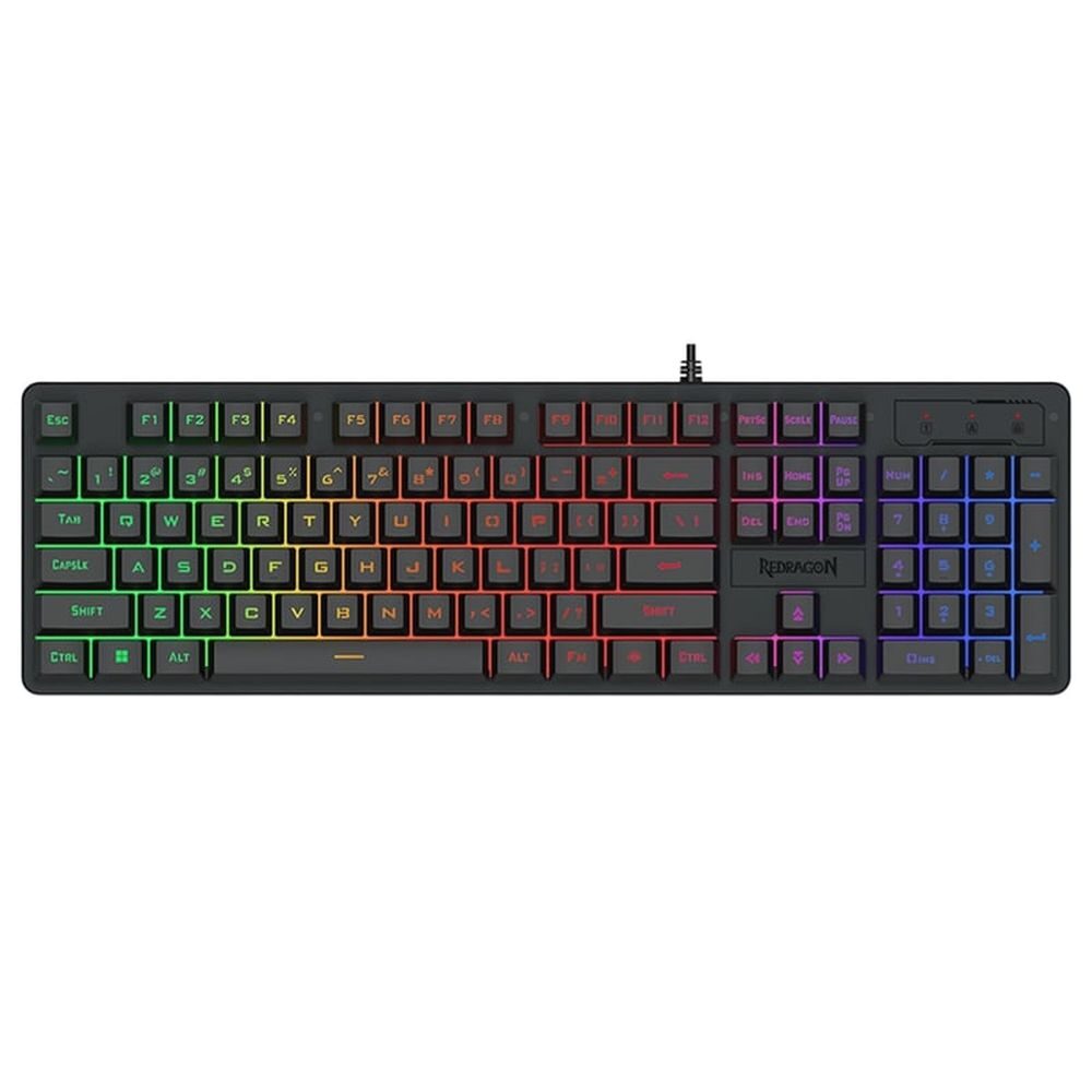 Tastatura gaming Redragon Netherbane neagra iluminare RGB, 19 taste fara conflict (19-key rollover), iluminareRGB fixa a tastelor (reglarea intensitatii si diverse efecte de iluminare), 8 taste multimedia, tasta WIN poate fi dezactivata in timpul jocurilor, conector USB, lungime cablu: 180mm, dimensiuni: 434x128x31mm, greutate: 581g