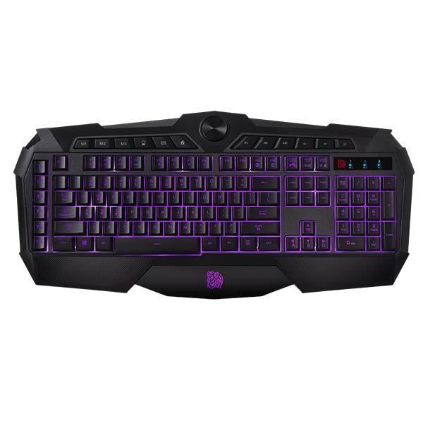 Tt eSPORTS CHALLENGER Prime, iluminare LED multicolora (albastru, rosu, violet) cu posibilitatea controlului intensitatii luminoase si diverse efecte de lumina, polling rate: 1000Hz, software pentru configurare (posibilitatea setarii a 3 profile, posibilitatea salvarii profilelor in memoria tastaturii, profilele por fi schimbate direct de pe tastatura), anti ghosting: 6-8 taste, 6 taste macro, 9 taste multimedia, dimensiuni: 508 x 239 x 24mm, lungime cablu: 1.5m, USB