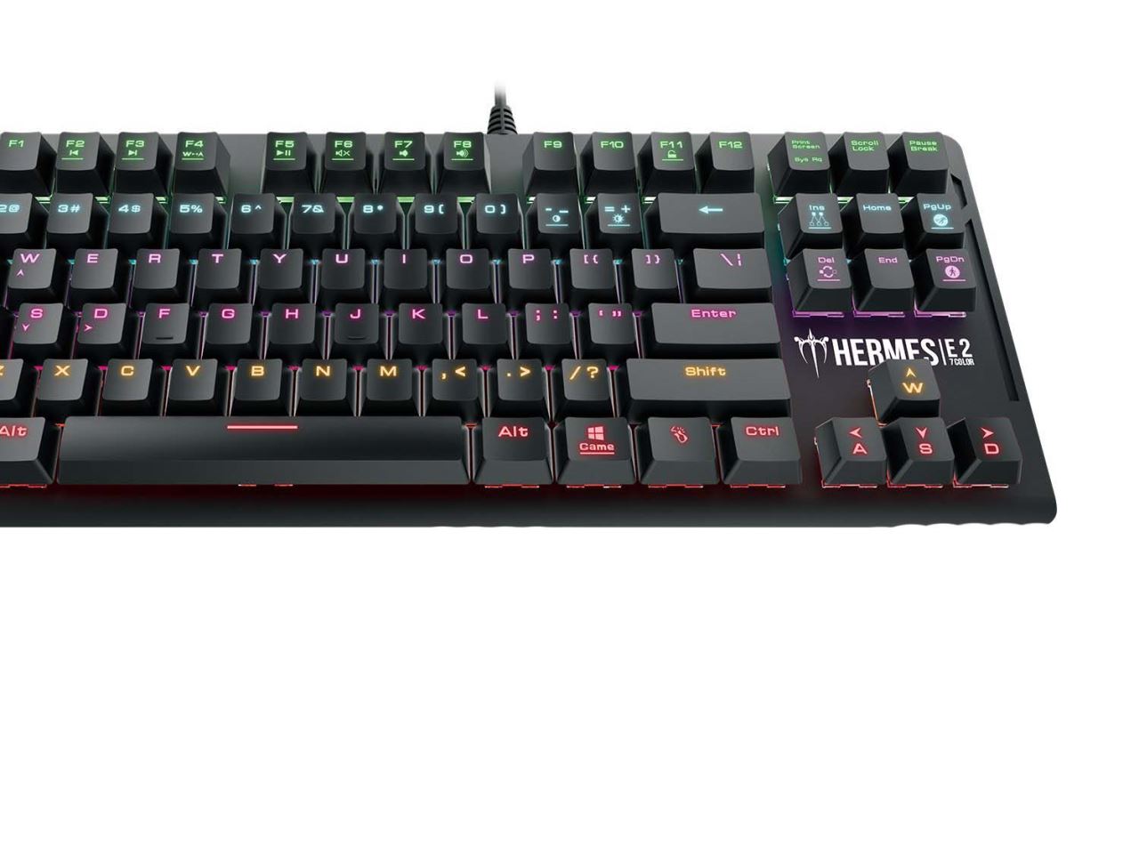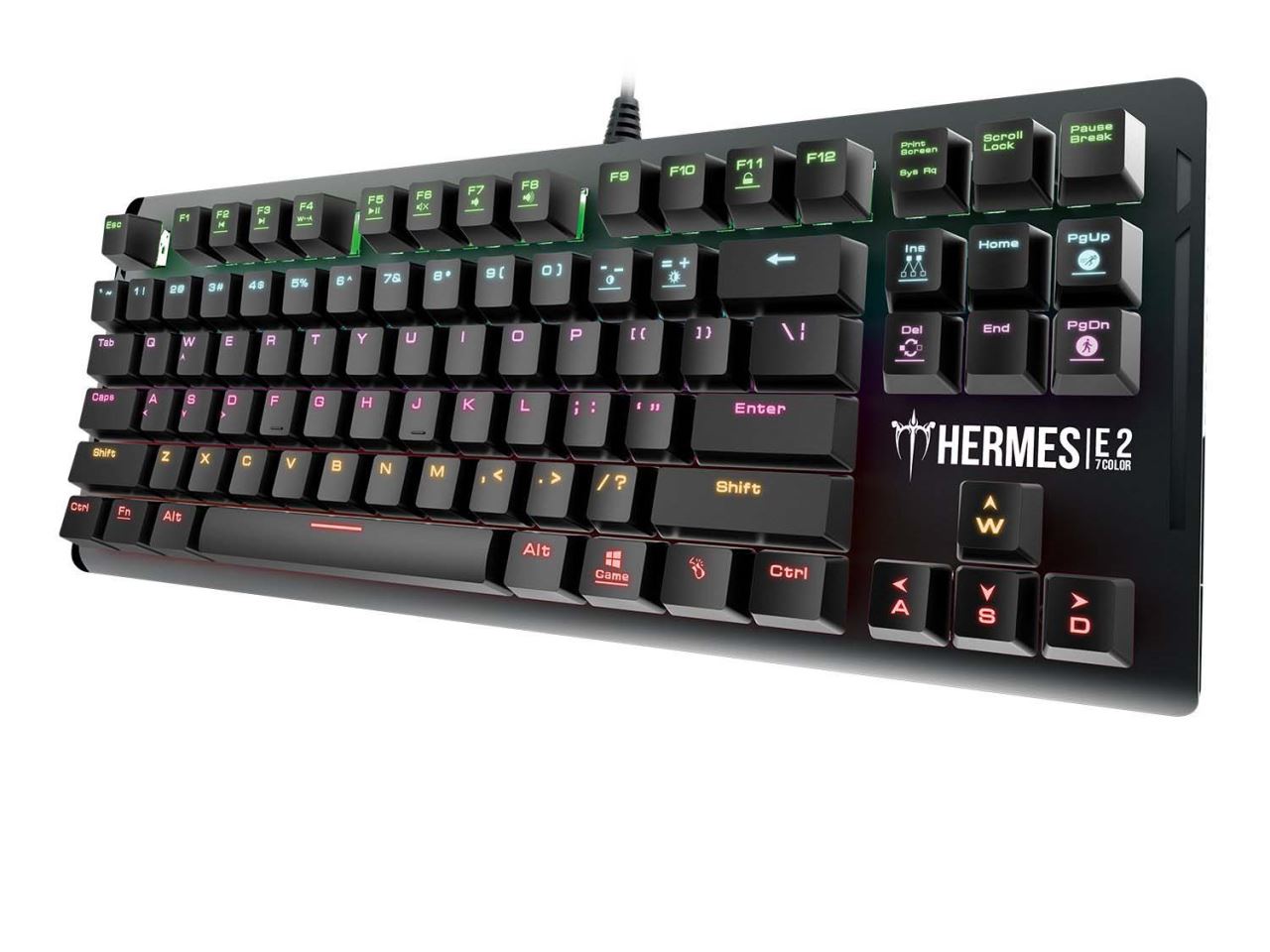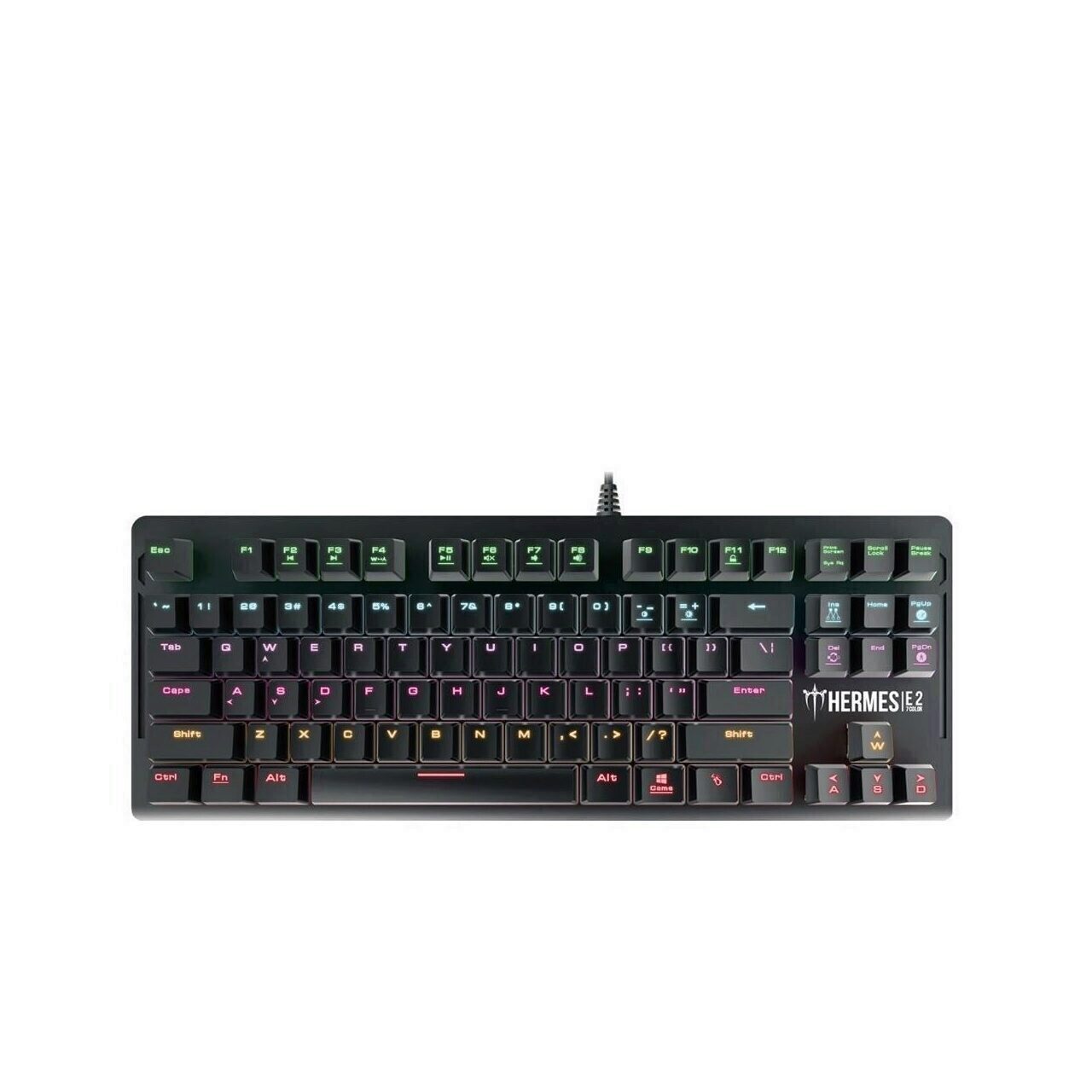 Gamdias Hermes E2 Combo Brown Switches, tastatura mecanica cu switch-uri GAMDIAS Brown (durata de viata: 50 milioane apasari), 87 de taste, iluminare Rainbow, taste anti-ghosting, toate tastele fara conflict (n-key rollover), 6 taste multimedia, caracterele de pe taste nu se sterg datorita constructiei prin injectie dubla de plastic (double shot injection keycaps), mod schimbare WASD/Taste directionale, posibilitatea dezactivarii tastei Windows, lungime cablu: 1.5m, conector USB, dimensiuni: 370 x 140 x 30 mm, greutate: 0.675kg