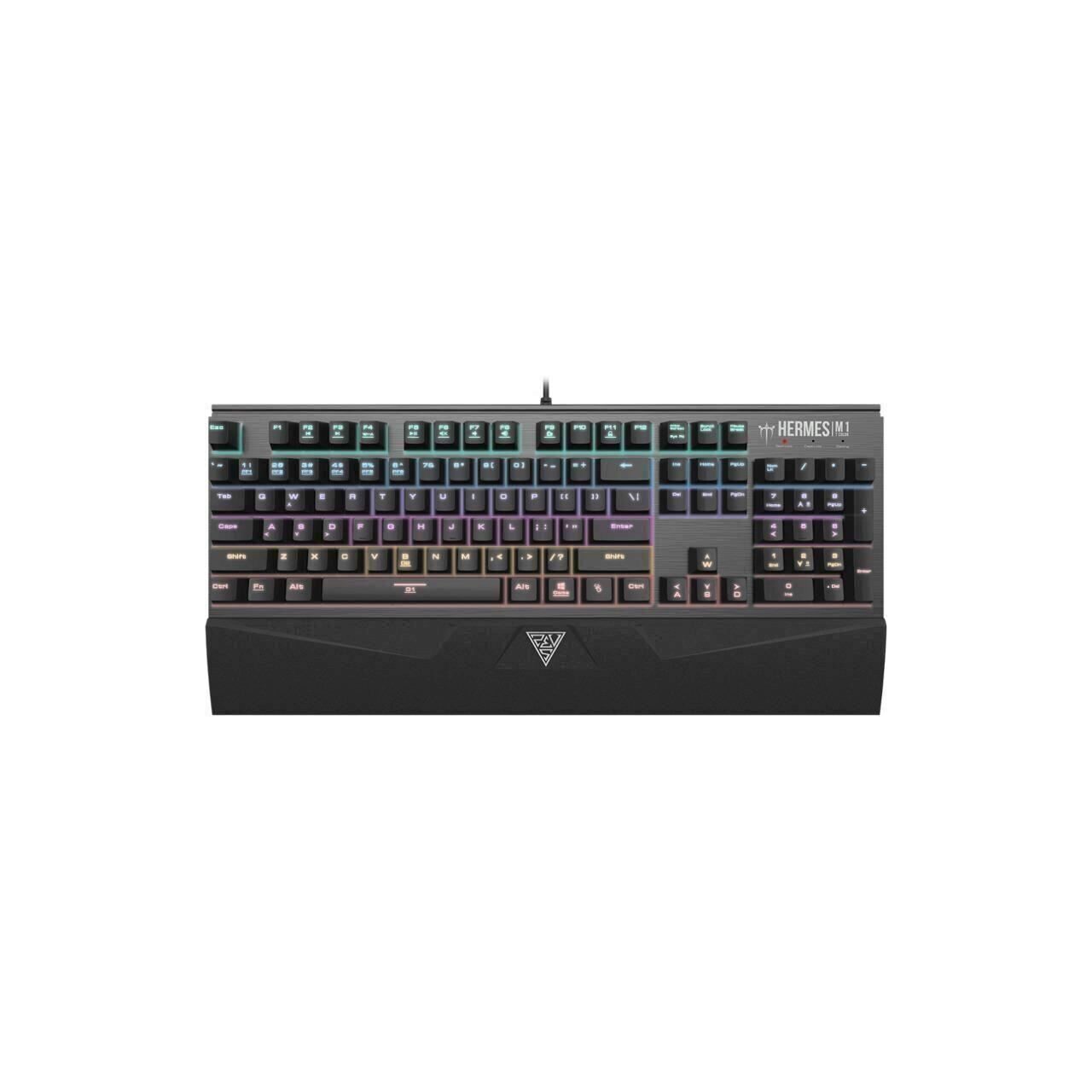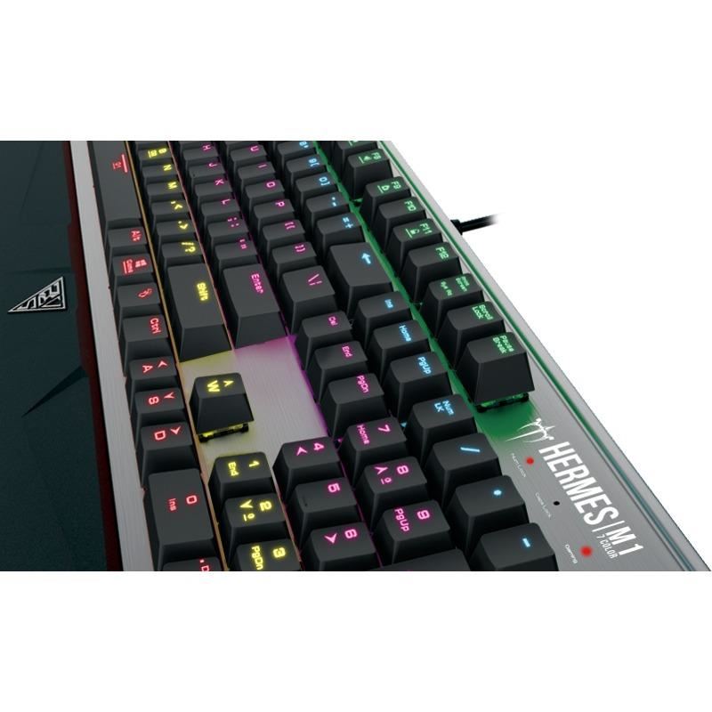 GAMDIAS HERMES M1 7COLOR, tastatura mecanica cu switch-uri GAMDIAS Brown (durata de viata: 50 milioane apasari), iluminare LED cu 7 culori disponibile (Neon Light Spectrum), taste anti-ghosting, 21 de taste fara conflict (21-key rollover), 2 taste macro programabile (6 profile accesibile de pe tastatura, 12 setari), posibilitatea inregistrarii macro-urilor On-The-Fly, 6 taste multimedia, caracterele de pe taste nu se sterg datorita constructiei prin injectie dubla de plastic (double shot injection keycaps), polling rate: 1000Hz, mod schimbare WASD/Taste directionale, sasiu de aluminiu, posibilitatea dezactivarii tastei Windows, suport detasabil pentru incheieturile mainilor, personalizare si configurare cu ajutorul programului GAMDIAS HERA, memorie on-board: 256KB, lungime cablu: 1.8m, conector USB placat cu aur, dimensiuni: 448x202.4x36.9mm (cu suport incheieturi maini) / 448x156.6x36.9mm (fara suport incheieturi maini), greutate: 1.56kg (cu suport incheieturi maini) / 1.3kg (fara suport incheieturi maini)