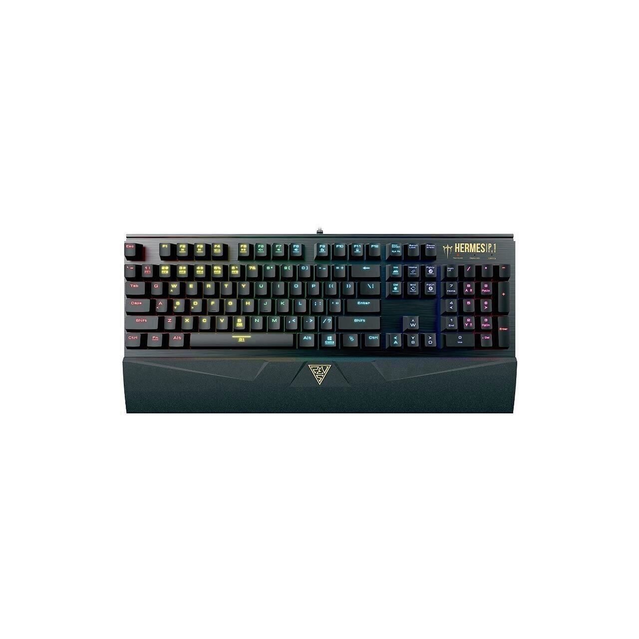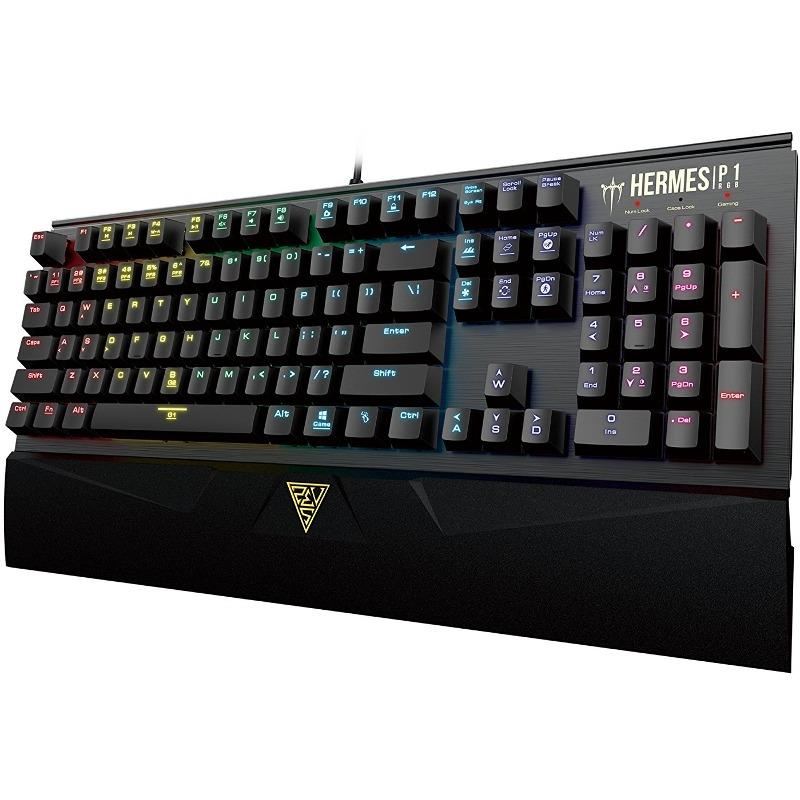 GAMDIAS HERMES P1 RGB, tastatura mecanica cu switch-uri GAMDIAS Brown (durata de viata: 50 milioane apasari), iluminare RGB (16.8 milioane de culori disponibile) si diverse efecte de iluminare (13 efecte predefinite, posibilitatea configurarii propriilor moduri de iluminare prin intermediul programului GAMDIAS HERA), taste anti-ghosting, toate tastele fara conflict (n-key rollover), 2 taste macro programabile (6 profile accesibile de pe tastatura, 12 setari), posibilitatea inregistrarii macro-urilor On-The-Fly, 6 taste multimedia, caracterele de pe taste nu se sterg datorita constructiei prin injectie dubla de plastic (double shot injection keycaps), polling rate: 1000Hz, mod schimbare WASD/Taste directionale, sasiu de aluminiu, posibilitatea dezactivarii tastei Windows, suport detasabil pentru incheieturile mainilor, 4 setari predefinite pentru jocuri populare (League of Legends, Dota 2, Counter-Strike si World of Tanks), personalizare si configurare cu ajutorul programului GAMDIAS HERA, memorie on-board: 72KB, lungime cablu: 1.8m, conector USB placat cu aur, dimensiuni: 448x202.4x36.9mm (cu suport incheieturi maini) / 448x156.6x36.9mm (fara suport incheieturi maini), greutate: 1.56kg (cu suport incheieturi maini) / 1.3kg (fara suport incheieturi maini)