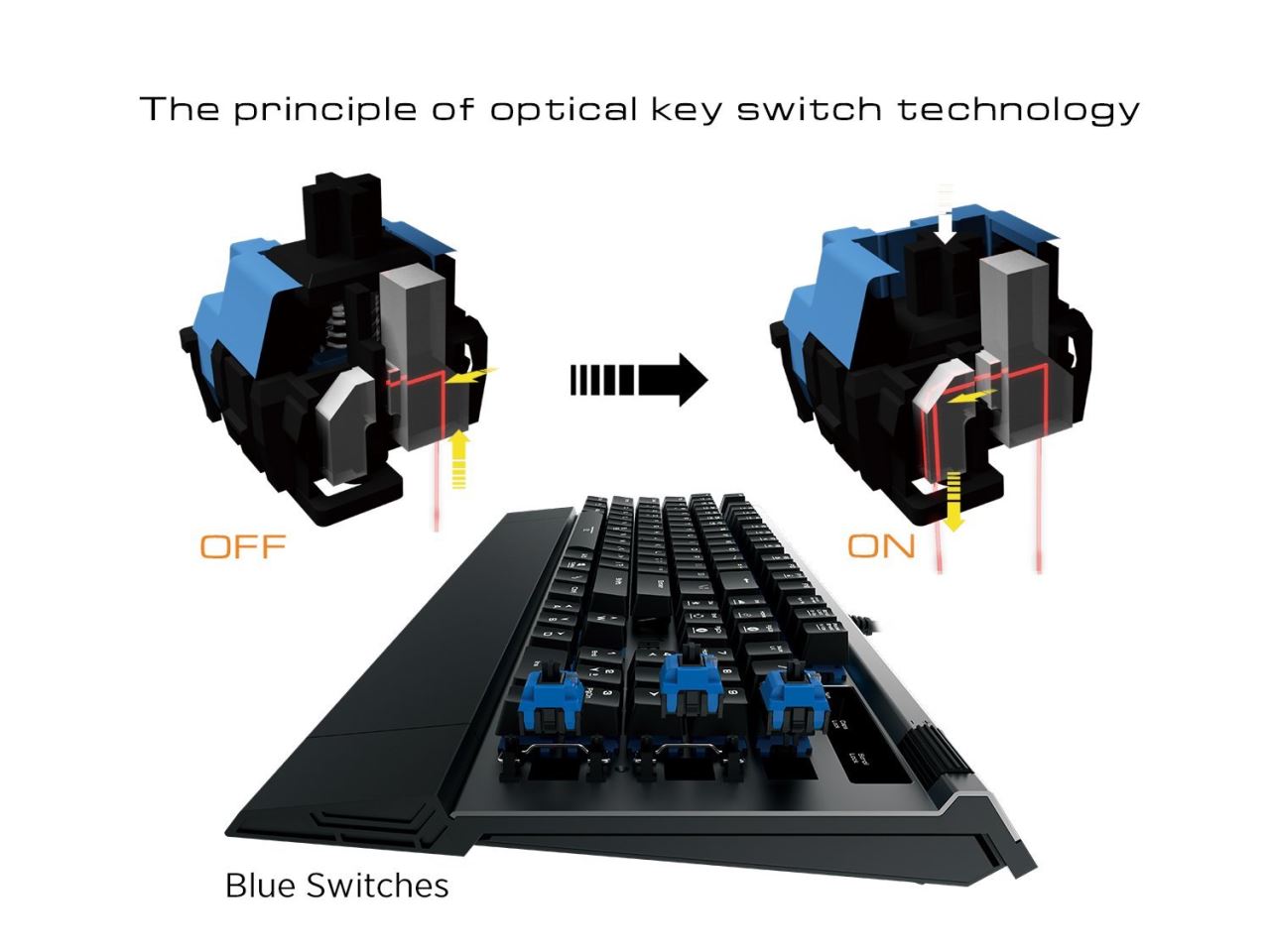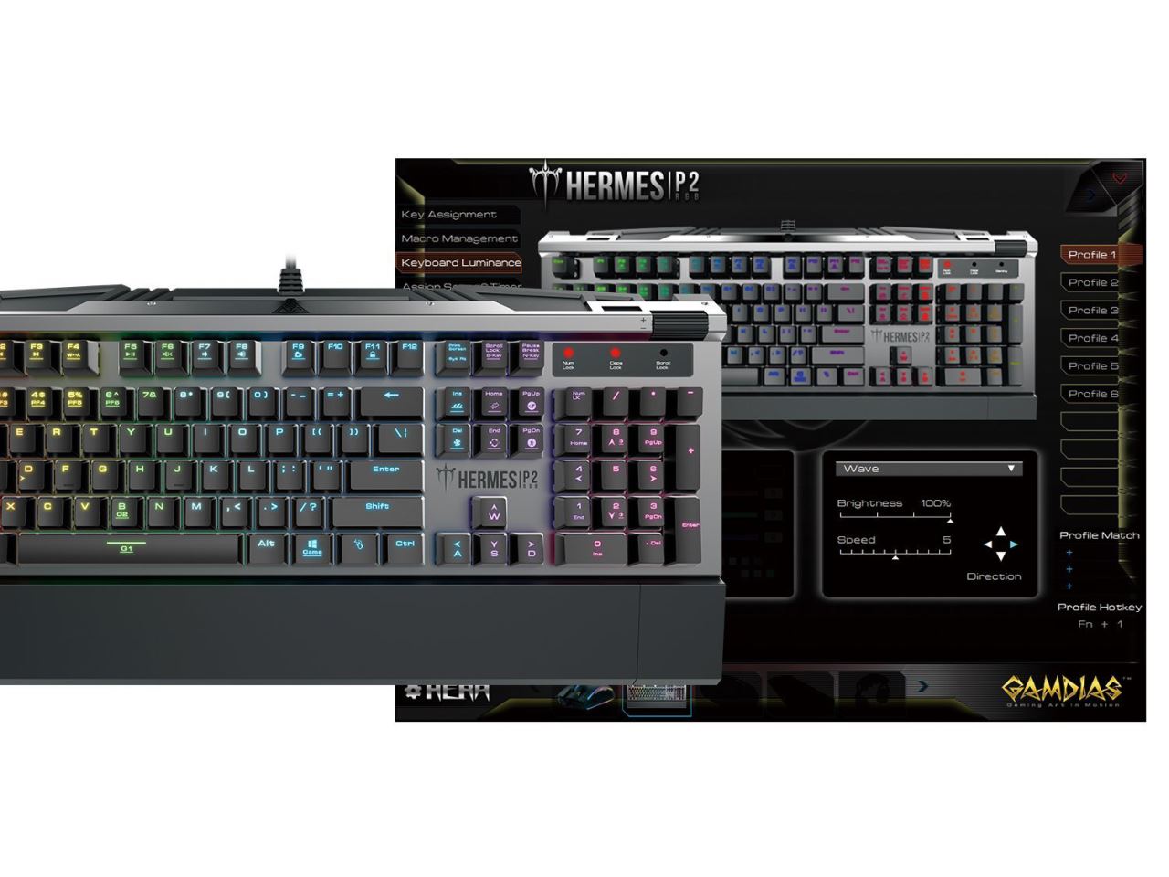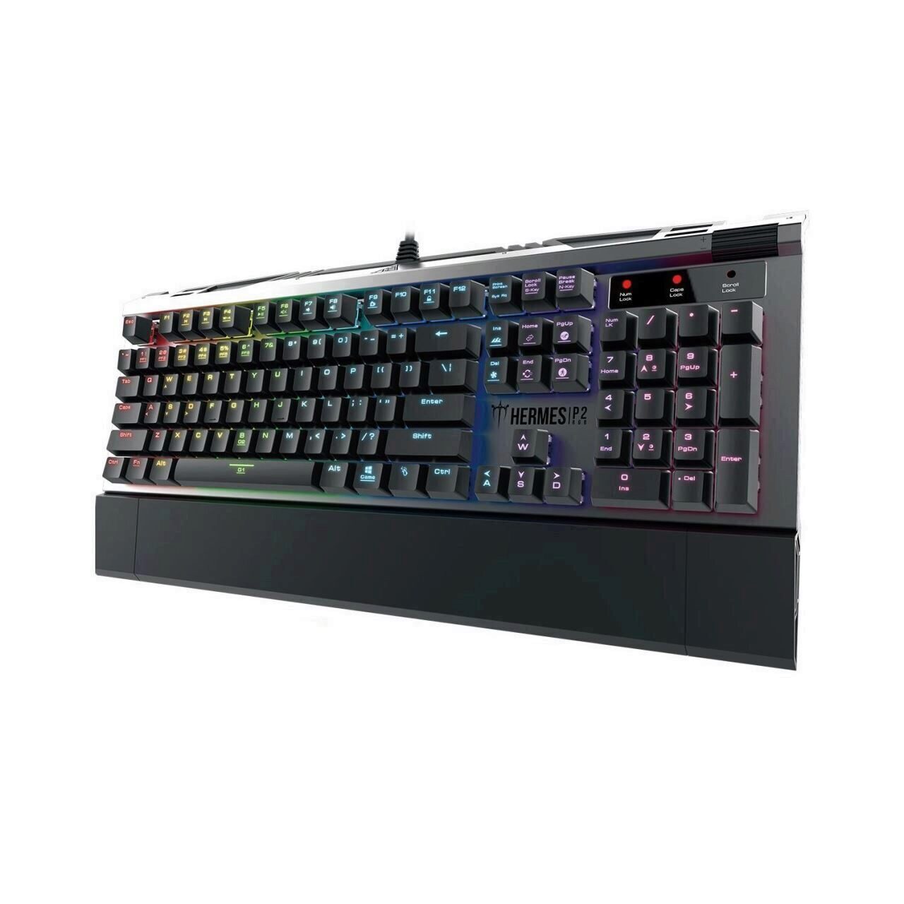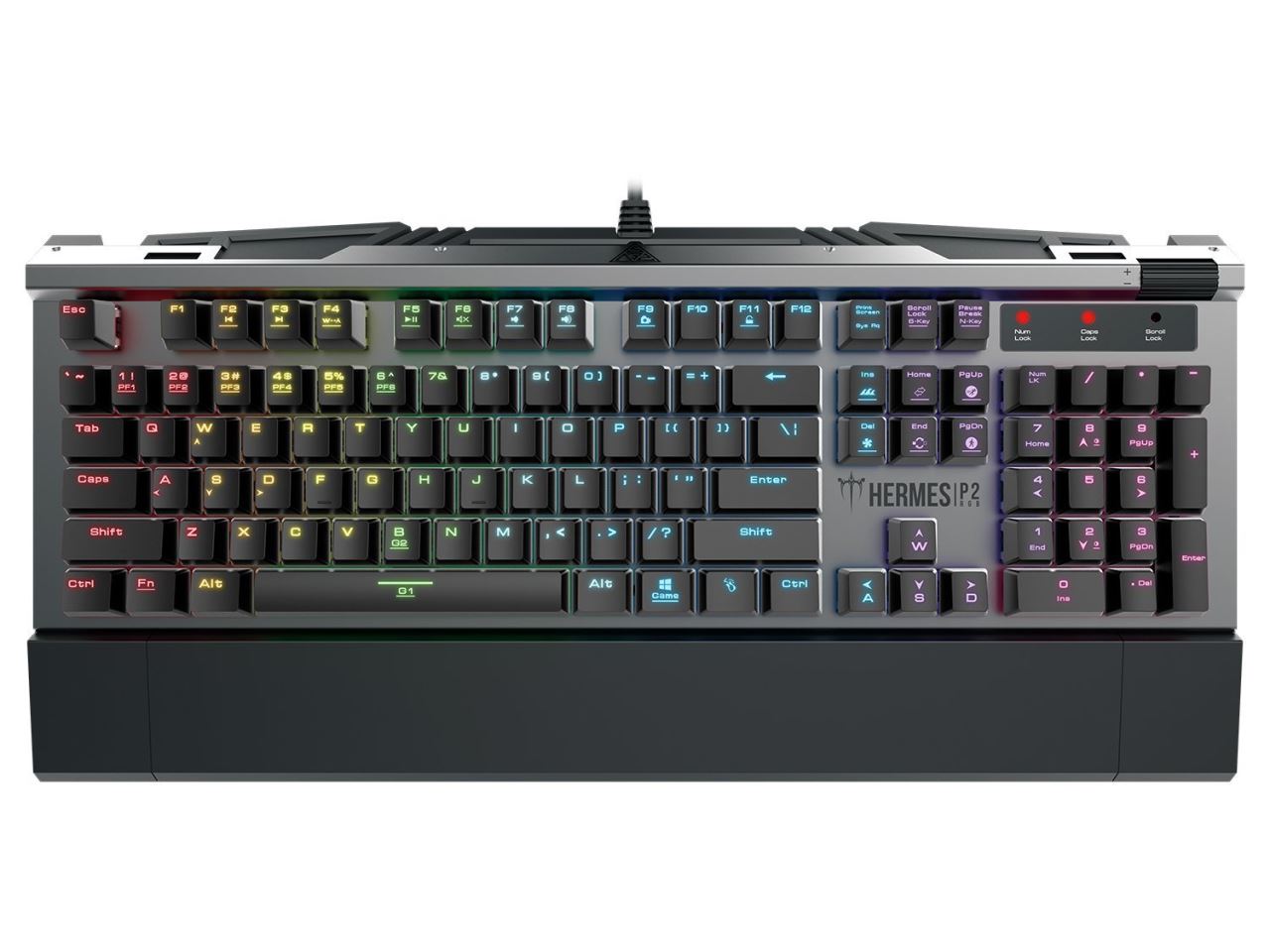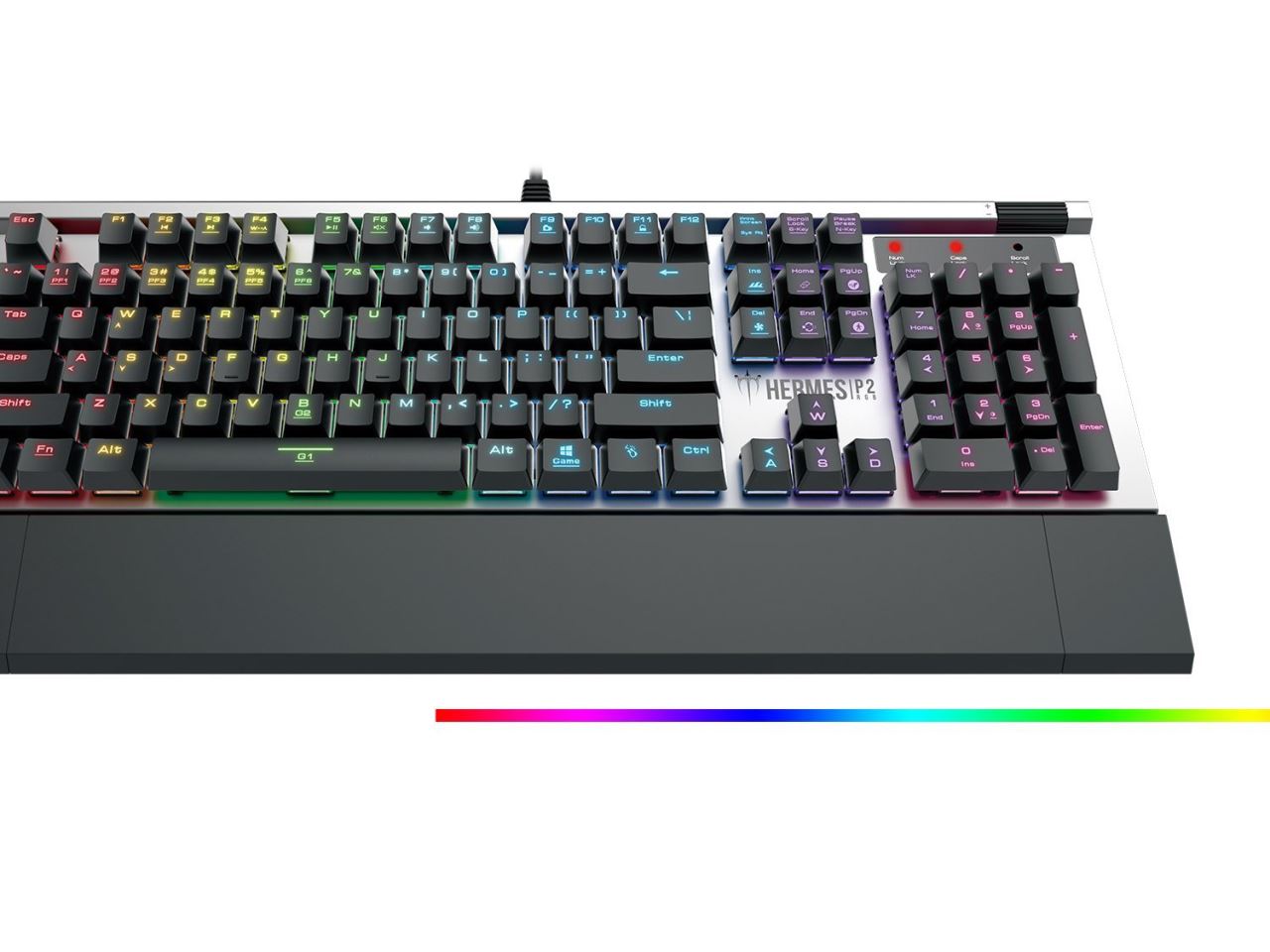 Gamdias Hermes P2 RGB Keyboard, tastatura mecanica cu switch-uri optice GAMDIAS Brown (durata de viata: 50 milioane apasari), iluminare RGB (16.8 milioane de culori disponibile) si diverse efecte de iluminare (13 efecte predefinite, posibilitatea configurarii propriilor moduri de iluminare prin intermediul programului GAMDIAS HERA), taste anti-ghosting, toate tastele fara conflict (n-key rollover), 2 taste macro programabile (6 profile accesibile de pe tastatura, 12 setari), posibilitatea inregistrarii macro-urilor On-The-Fly, 6 taste multimedia, caracterele de pe taste nu se sterg datorita constructiei prin injectie dubla de plastic (double shot injection keycaps), polling rate: 1000Hz, mod schimbare WASD/Taste directionale, sasiu de aluminiu, posibilitatea dezactivarii tastei Windows, suport pentru incheieturile mainilor, setari predefinite pentru jocuri populare (MOBA & FPS), personalizare si configurare cu ajutorul programului GAMDIAS HERA, memorie on-board: 72KB, lungime cablu: 1.8m, conector USB placat cu aur, dimensiuni: 458 x 220 x 44 mm (cu suport incheieturi maini), greutate: 1.1kg (cu suport incheieturi maini)