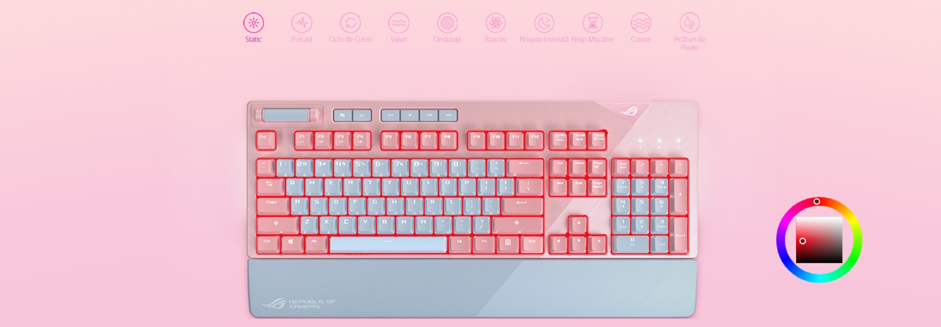 Fiind prevăzută cu switch-uri Cherry MX RGB, tastatura ROG Strix Flare PNK LTD asigură răspunsul mecanic precis pe care îl preferă pasionații de jocuri și entuziaștii. Switch-urile de calitate superioară sunt fabricate în Germania și sunt renumite pentru distanța de acționare optimă și pentru răspunsul excelent la fiecare apăsare.