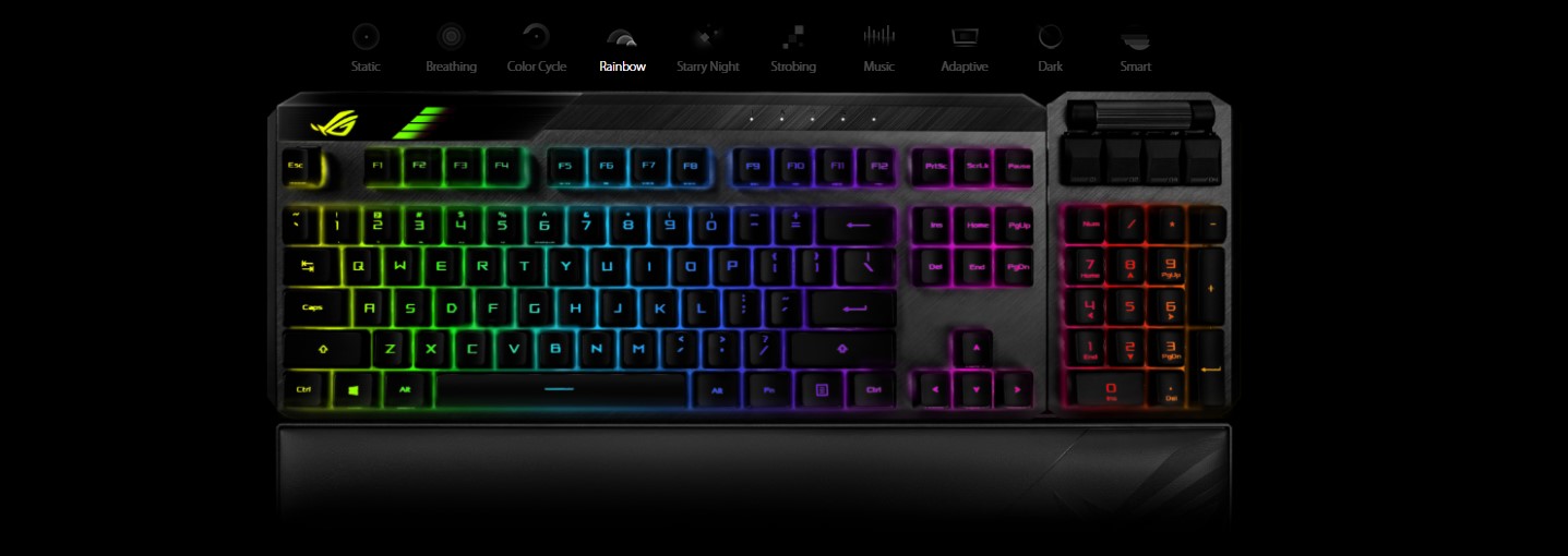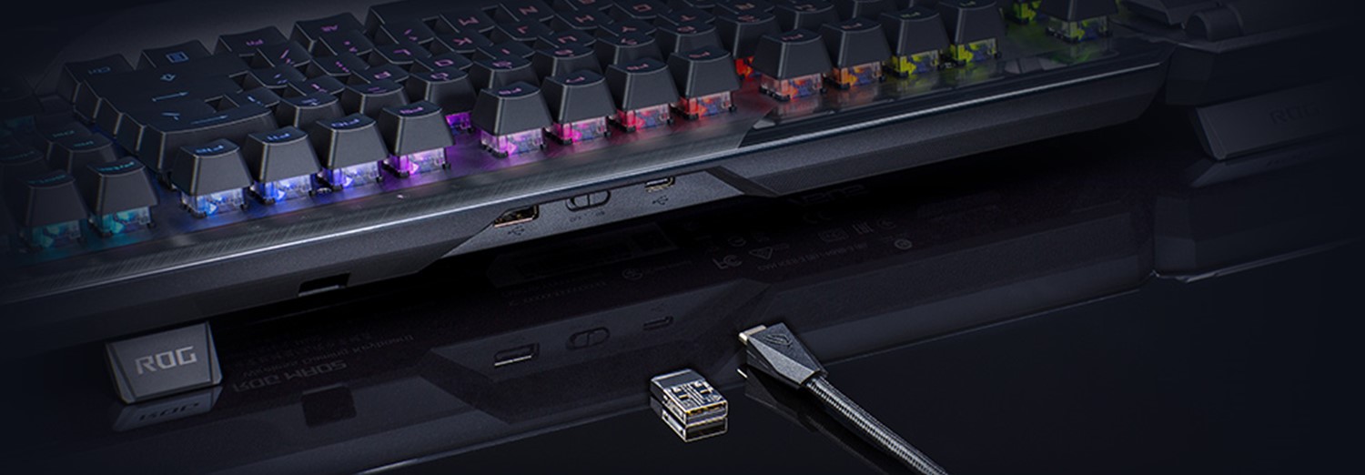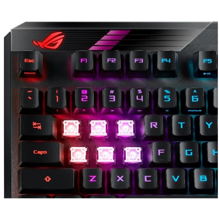 Comutatoarele opto-mecanice ROG RX Red și RX Blue oferă taste rezistente, care nu se clatină, cu un timp de răspuns super-rapid de 1 ms și o durată de viață de 100 de milioane de apăsări. Aceste comutatoare premium au un design al tijei pătrat și au integrate LED-uri RGB care oferă o iluminare completă per-tastă.