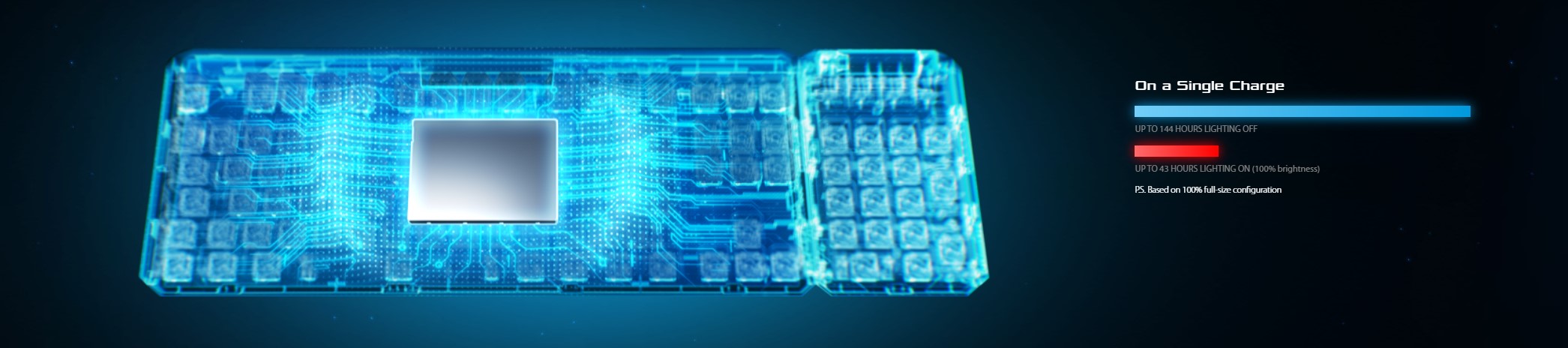 - Durată de viață remarcabilă a bateriei: Bateria de 4.000 mAh oferă până la 43 de ore de utilizare (dimensiune completă cu iluminare pornită), iar tastatura include și un indicator LED încorporat pentru afișarea nivelului bateriei