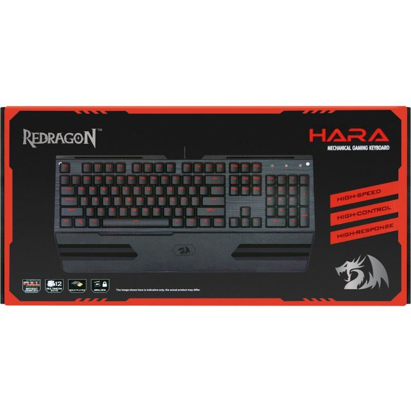 Redragon Hara Black, tastatura mecanica, durata de viata a tastelor: 50 milioane apasari, toate tastele fara conflict (n-key rollover), 12 taste multimedia, iluminare LED multicolora a tastelor (reglarea intensitatii luminoase, 9 efecte de iluminare, 8 profile de iluminare predefinite si 2 profile configurabile), design premium cu carcasa construita din aluminiu, 12 taste multimedia, tasta WIN poate fi dezactivata in timpul jocurilor, caracterele de pe taste nu se sterg datorita constructiei prin injectie dubla de plastic (double shot injection keycaps), conector USB placat cu aur, USB