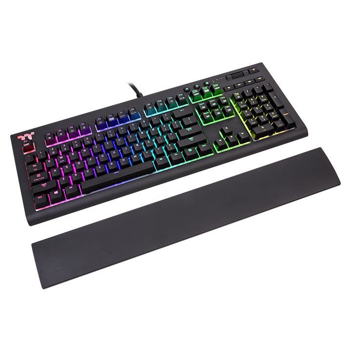 Thermaltake Premium X1 RGB Black/Silver Keyboard, tastatura mecanica cu switch-uri Cherry MX Silver (durata de viata: 50 milioane de apasari), iluminare LED RGB individuala a tastelor (12 efecte de iluminare, 5 zone de iluminare pre-configurate – FPS1/FPS2/MOBA/MMORPGsincronizare cu restul produselor RGB Thermaltake, comenzi vocale prin intermediul telefonului mobil), taste anti-ghosting, toate tastele fara conflict (n-key rollover), polling rate: 1000Hz, include 8 taste rosii aditionale (Q, W, E, R, A, S, D, F), palm rest magnetic, lungime cablu: 1.8m, conectori: USB si port Jack 3.5mm, conector USB placat cu aur, dimensiuni: 464.98 x 170.52 x 40.39 mm, greutate: 1.6kg, USB