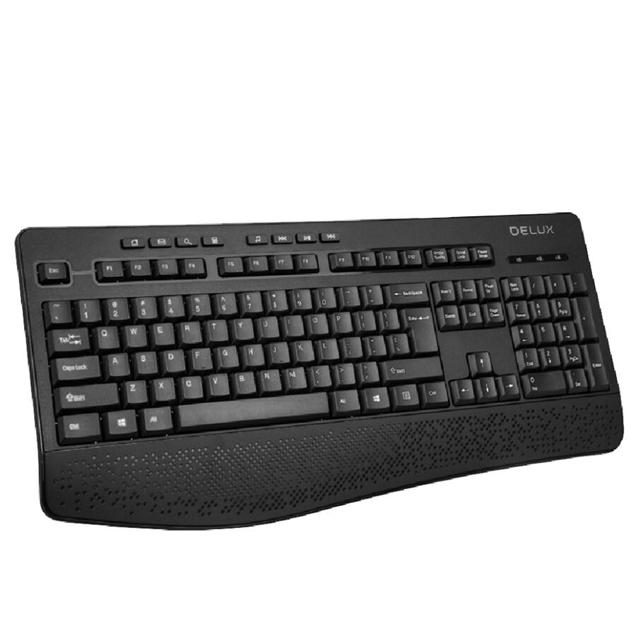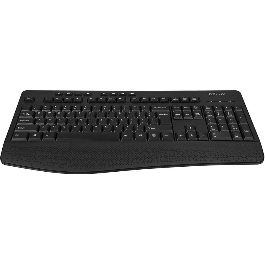 Tastatura wireless Delux K6060G neagra, design ergonomic, 25 taste fara conflict (25-key rollover), 8 taste multimedia, numar butoane: 112, conectivitate: bluetooth sau 2.4Ghz, palmrest textil, dimensiuni tastatura: 446x211x24mm