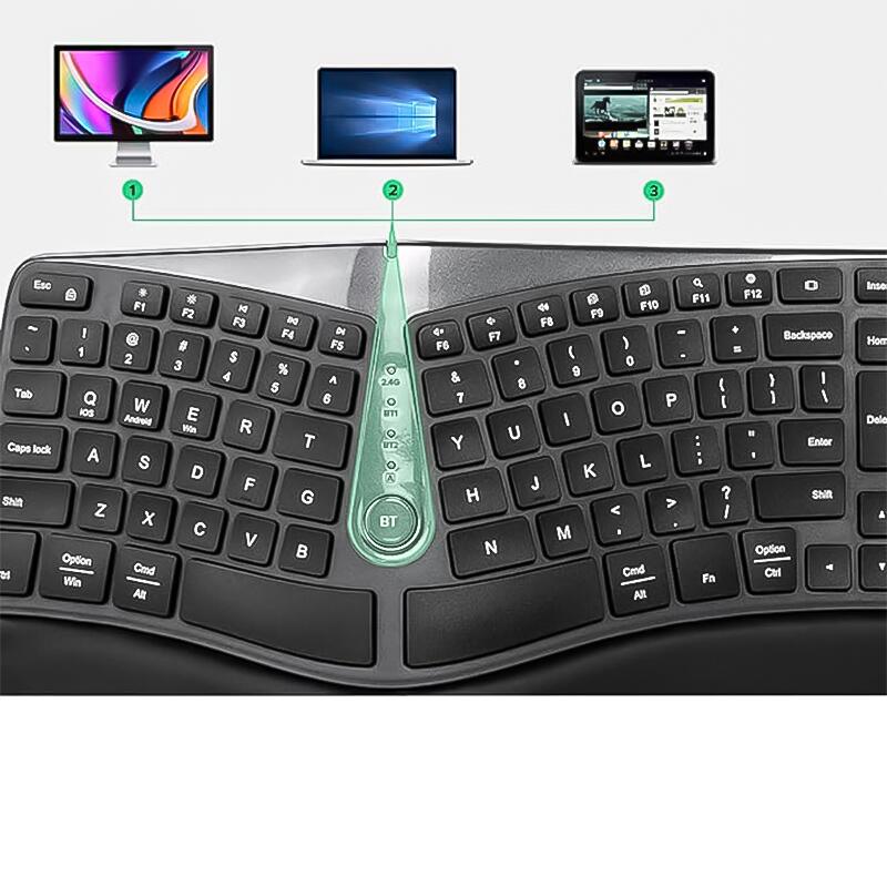Conectivitatea acestei tastaturi este la fel de flexibila precum functionalitatea sa, oferind doua optiuni: Bluetooth (pe 2 canale) sau 2.4GHz. Aceasta versatilitate va permite sa va conectati usor la diferite dispozitive, indiferent de platforma lor de conectivitate preferata. Astfel, puteti folosi tastatura cu o gama larga de dispozitive, de la computere si laptopuri la tablete si telefoane inteligente.
