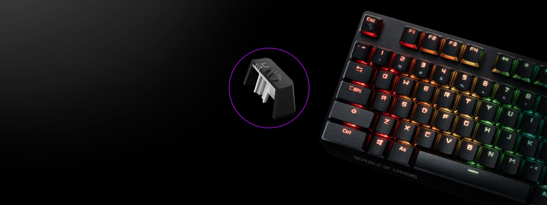 Un proces precis de turnare prin injectare dublă de plastic rezultă în taste translucide care au inscripții ROG unice și perfecte care le conferă un aspect unic, oferind tastaturii tale o iluminare de o consistență perfectă și un aspect care este inconfundabil ROG.