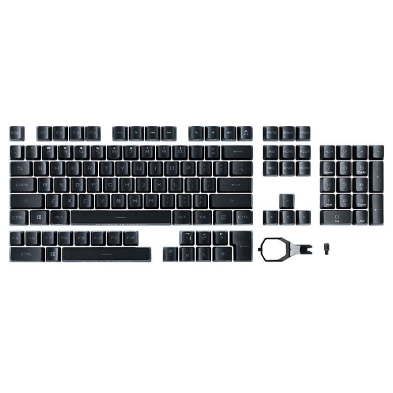 Taste de schimb pentru tastatura mecanica ASUS ROG PBT pentru ROG RX negre, caracterele de pe taste nu se sterg datorita constructiei prin injectie dubla de plastic (double shot injection keycaps), include cleste pentru indepartarea tastelor, pachetul include 123 de taste, 20 de stabilizatoare