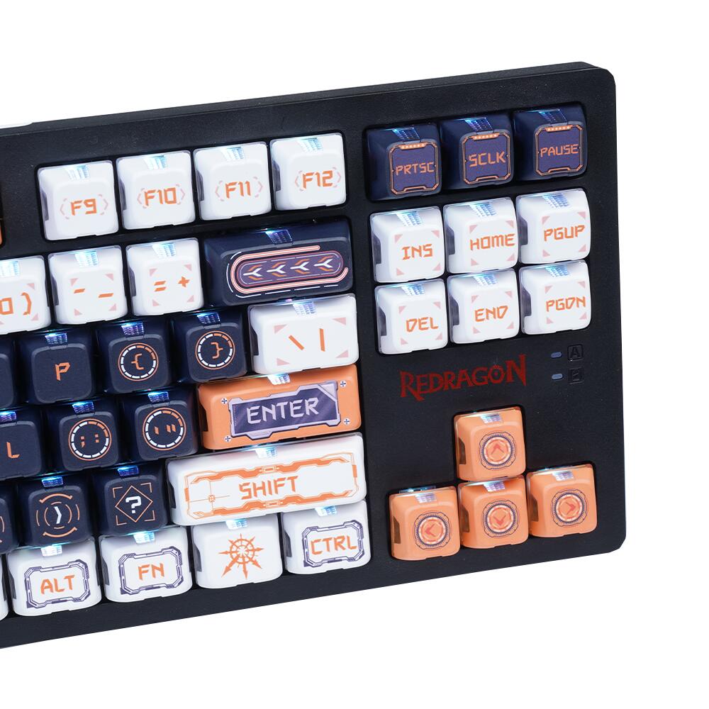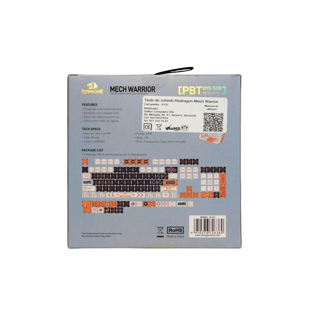 Taste de schimb pentru tastatura mecanica Redragon Mech Warrior, material: PBT, 125 taste pentru tastaturi mecanice, caracterele de pe taste nu se sterg datorita constructiei prin injectie dubla de plastic (double shot injection keycaps),design cu laterale transparente, include cleste pentru indepartarea tastelor