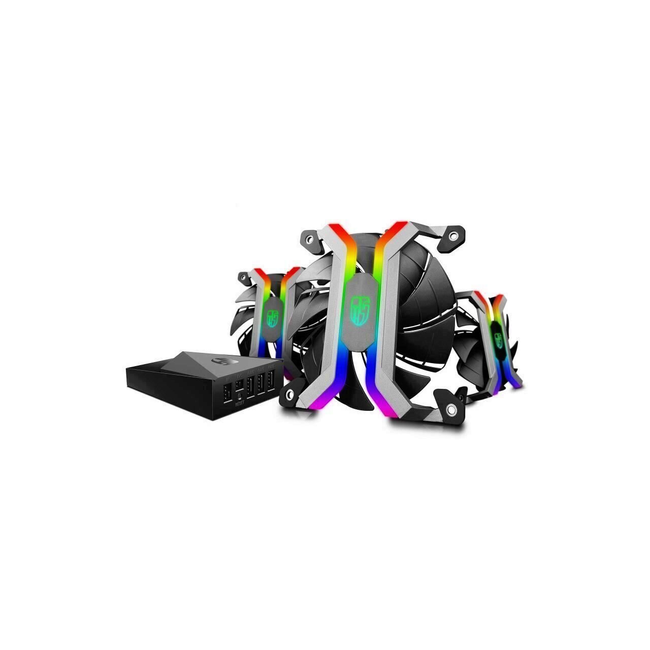 GamerStorm MF120 120mm 3 Fan Pack, design premium fara rama, iluminare LED RGB cu diverse efecte de iluminare, pale cu caneluri, rulmenti Hydro Bearing, 500±200 -2200±10%RPM, 56CFM, 37.9dB(A), include controller RGB cu WiFi permitand configurarea modurilor din aplicatia MF control disponibila pentru Android si iOS, conectori: 4pin (pentru controller), dimensiuni: 120x120x26mm, greutate: 530g