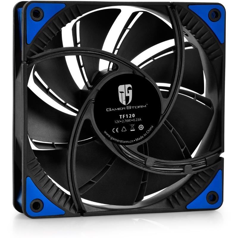 Deepcool TF120 120mm Blue LED fan, pale cu design in doua straturi pentru un nivel ridicat al presiunii aerului, rulmenti Fluid Dynamic Bearing, 500-1800 RPM, 76.52 CFM (12V) / 58.39 CFM (7V), 17.6-31.3 dBA, pale detasabile, rezistent la praf si apa, conectori: PWM si Molex, dimensiuni: 120x120x26mm, greutate: 204g