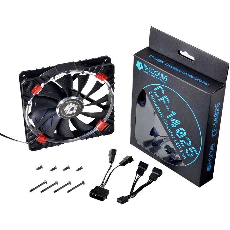 ID-Cooling CF-14025-R 140mm Concentric Circular Red LED fan, iluminare LED Rosie, rulmenti de tip Hydraulic Bearing, sistem de montare anti-vibratii, 200-1300 RPM, 65.5 CFM, 12.1-24.2 dBA, 1.82 mmH2O, conector 4-pin sau 4-pin Molex (cu adaptorul inclus), dimensiuni: 140x140x25mm, greutate: 160g