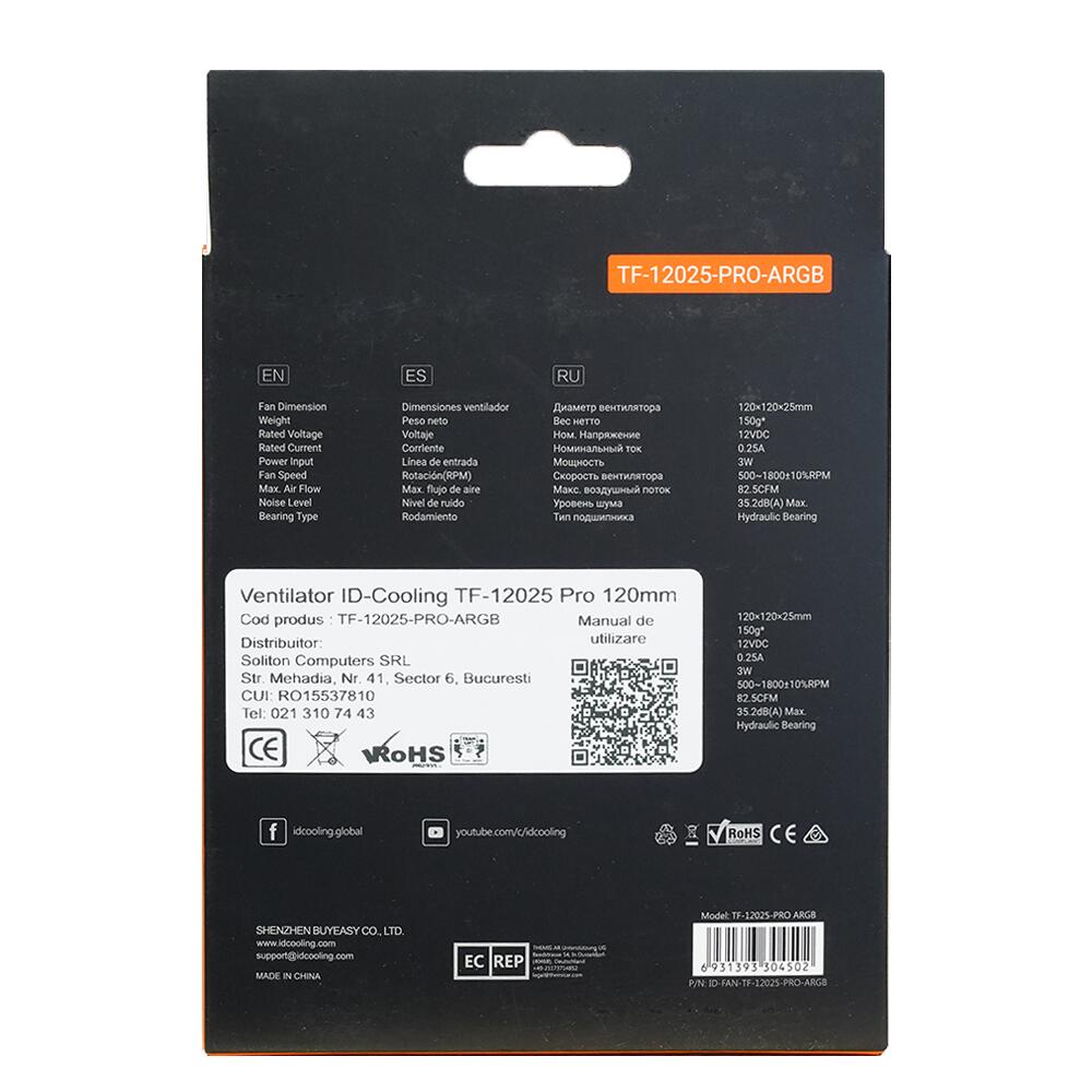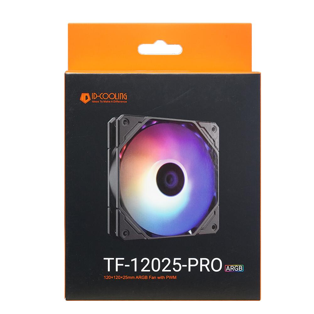 Ventilator ID-Cooling TF-12025 Pro 120mm iluminare aRGB, rulmenti de tip Hydraulic Bearing, sistem de montare anti-vibratii, 500-1800RPM, 82.5CFM, 35.2dBA, 2.55mmH2O, cablu plat, conector 4-pin PWM si 3pin aRGB, dimensiuni: 120x120x25mm, greutate: 150g