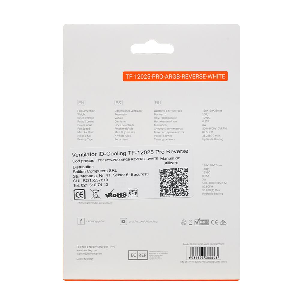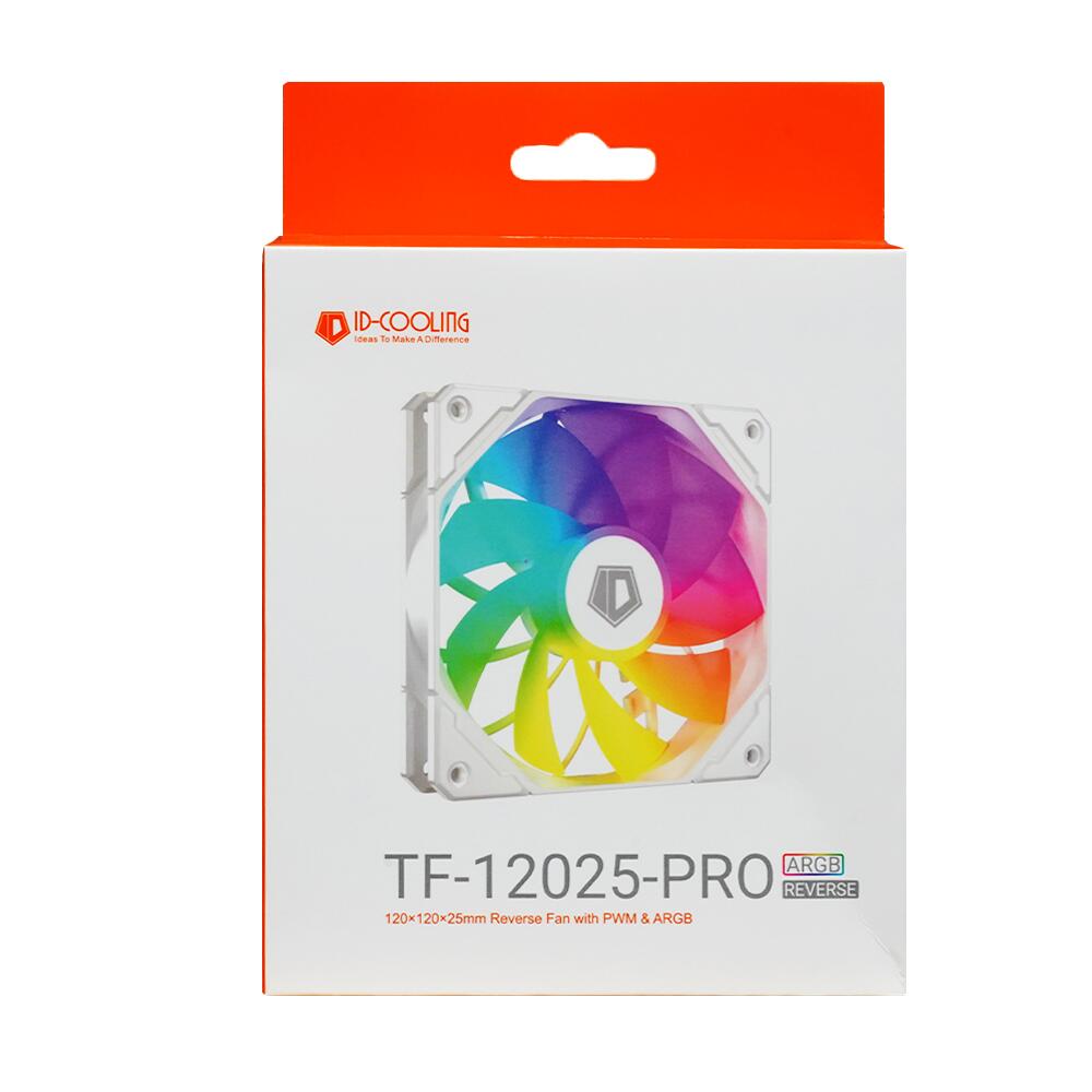 Ventilator ID-Cooling TF-12025 Pro Reverse 120mm alb iluminare aRGB, fluxul de aer este inversat fata de modelul TF-12025, rulmenti de tip Hydraulic Bearing, sistem de montare anti-vibratii, 500-1800RPM, 82.5CFM, 35.2dBA, 2.55mmH2O, cablu plat, conector 4-pin PWM pentru ventilator si conector 3-pin pentru pentru iluminare RGB adresabila, se sincronizare cu placile de baza care suporta aceasta funcite, dimensiuni: 120x120x25mm, greutate: 150g