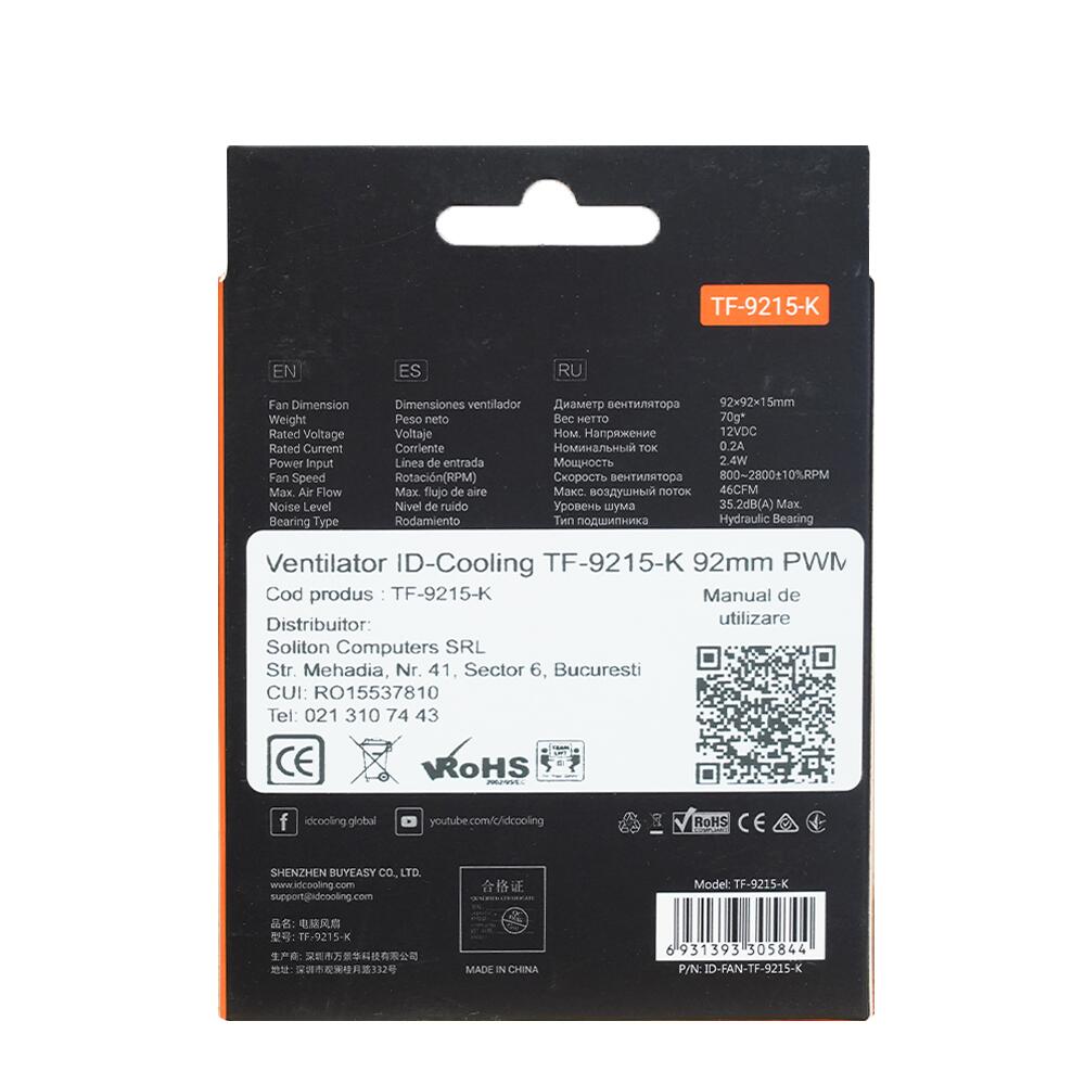 Ventilator ID-Cooling TF-9215-K 92mm PWM, rulmenti de tip Hydraulic Bearing, sistem de montare anti-vibratii, 800-2800±10%RPM, 46 CFM, 1.54mmH2O, 35.2 dBA, conector 4-pin PWM, dimensiuni: 92x92x15mm, greutate: 90g
