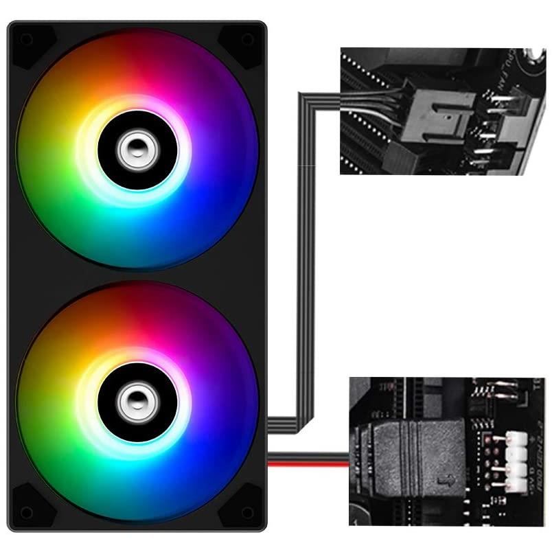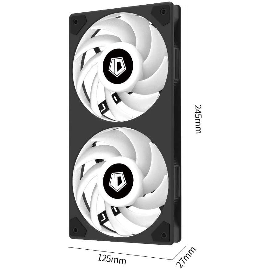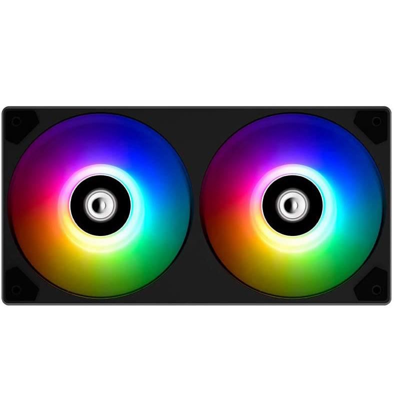 Ventilator radiator ID-Cooling ICEFAN 240 240mm iluminare aRGB, ventilator 240mm aRGB LED fan (design nou, o singura rama cu 2 ventilatoare de 120mm, o singura alimentare si un singur cablu de control) 2Ball Bearing aRGB fans 900~2000±10%RPM, 56.5 CFM, 16-31.5 dBA, 1.99mmH2O, PWM, conector 4pin pentru alimentarea ventilatoarelor si 3pin aRGB pentru sincronizarea LED-urilor cu placile de baza compatibile, dimensiuni: 245x125x27mm, greutate: 330g