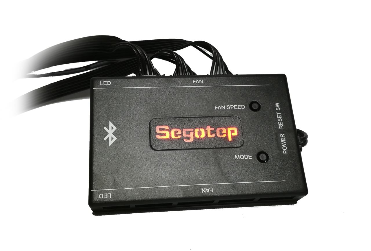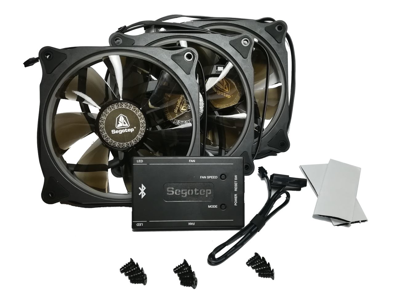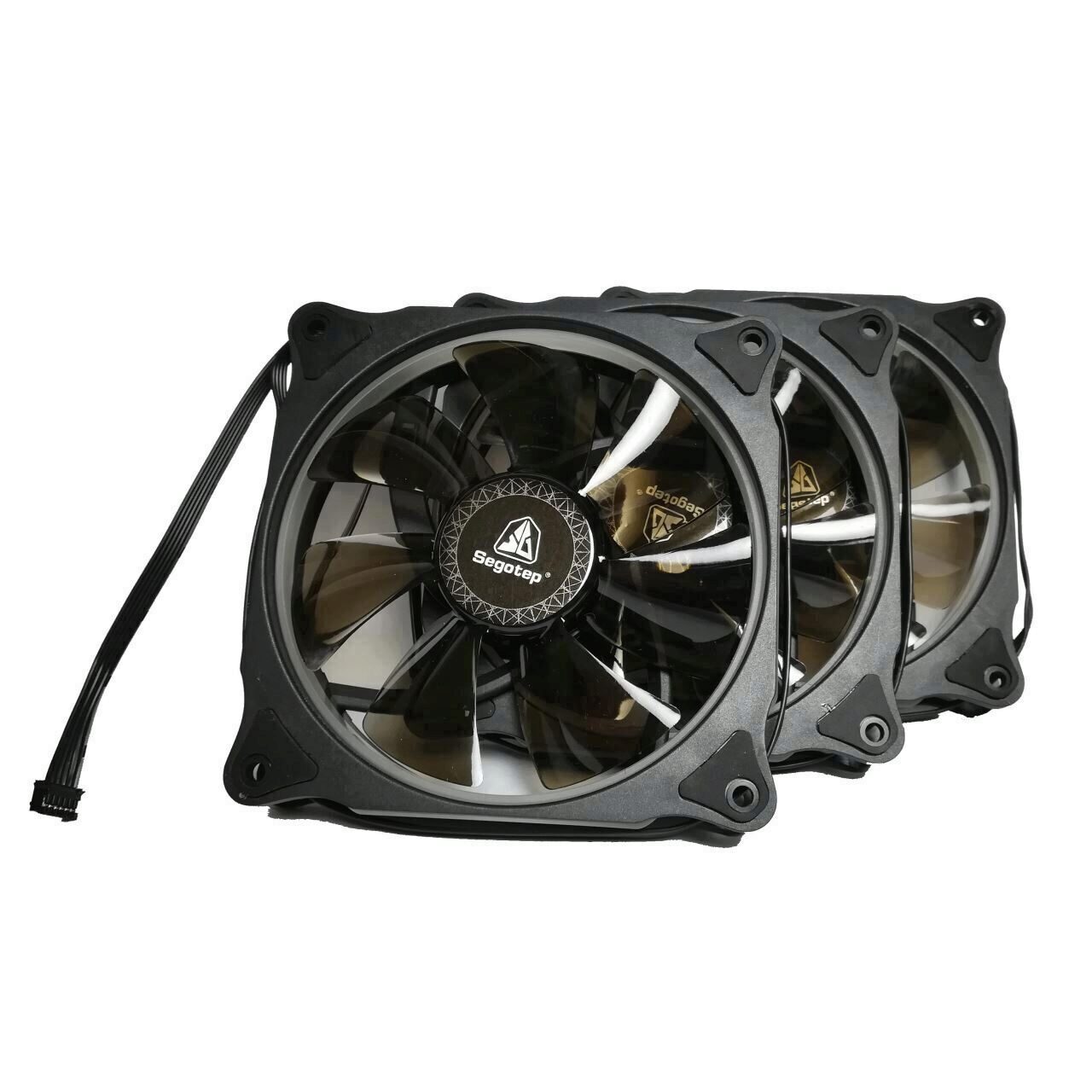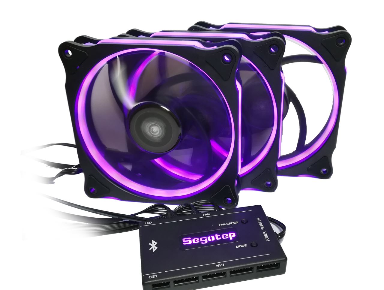 Segotep Halo Ring RGB 120mm Three fan kit, iluminare Ring LED RGB, sistem de montare anti-vibratii, 1100 RPM, 36 CFM, 22 dBA, 1.1 mmH2O, cablu plat, include modul de control prin Bluetooth Segotep RGB Hub (suporta pana la 8 ventilatoare si 2 benzi de LED-uri), dimensiuni: 120x120x25mm
