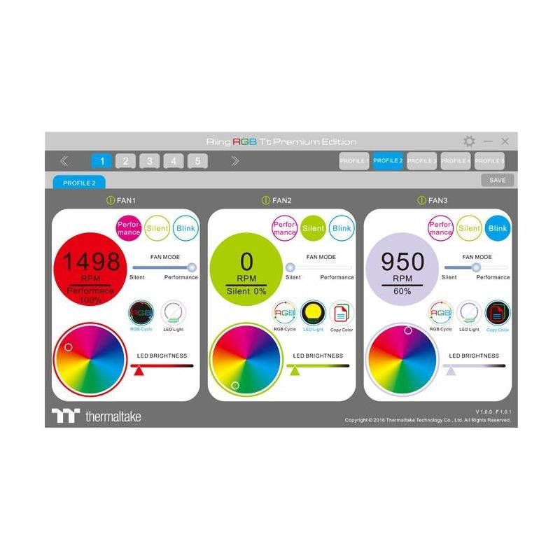 Thermaltake Riing 12 RGB Radiator Fan TT Premium Edition 120mm RGB LED Three fans pack, 500-1400 RPM, 48.79 CFM, 18.2-24.8 dBA, 1.113 mm-H2O, Hydraulic Bearing, interfata USB 2.0 pentru controlul functiilor prin software (compatibil Windows 7 / 8 / 8.1 / 10 si Android/iOS), greutate: 158 g