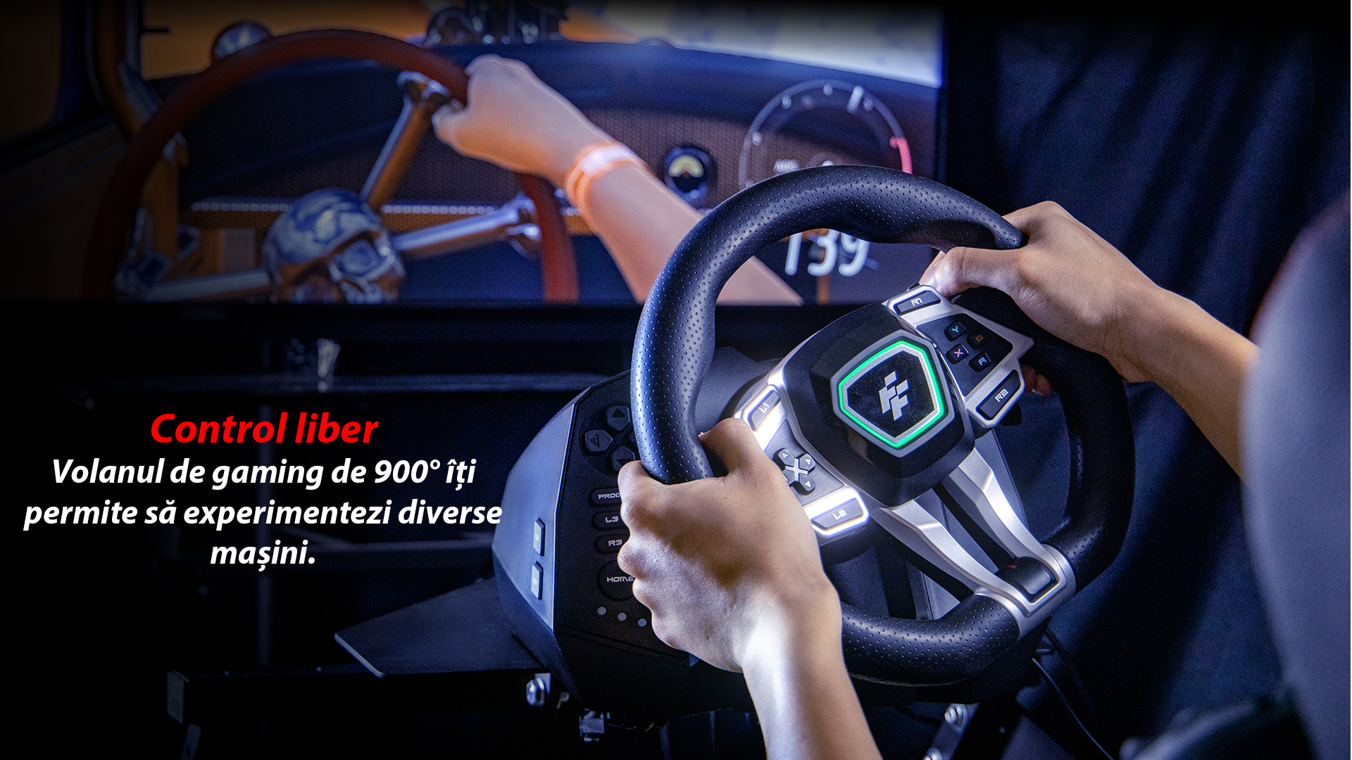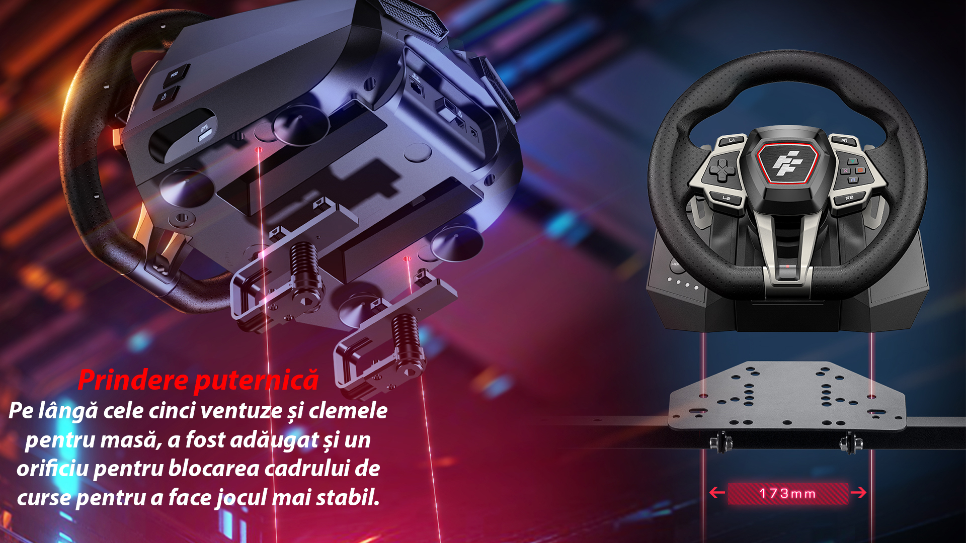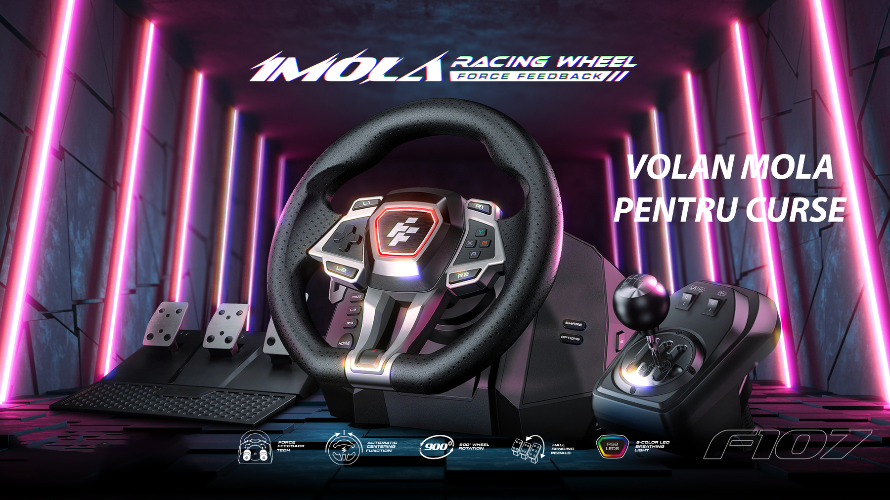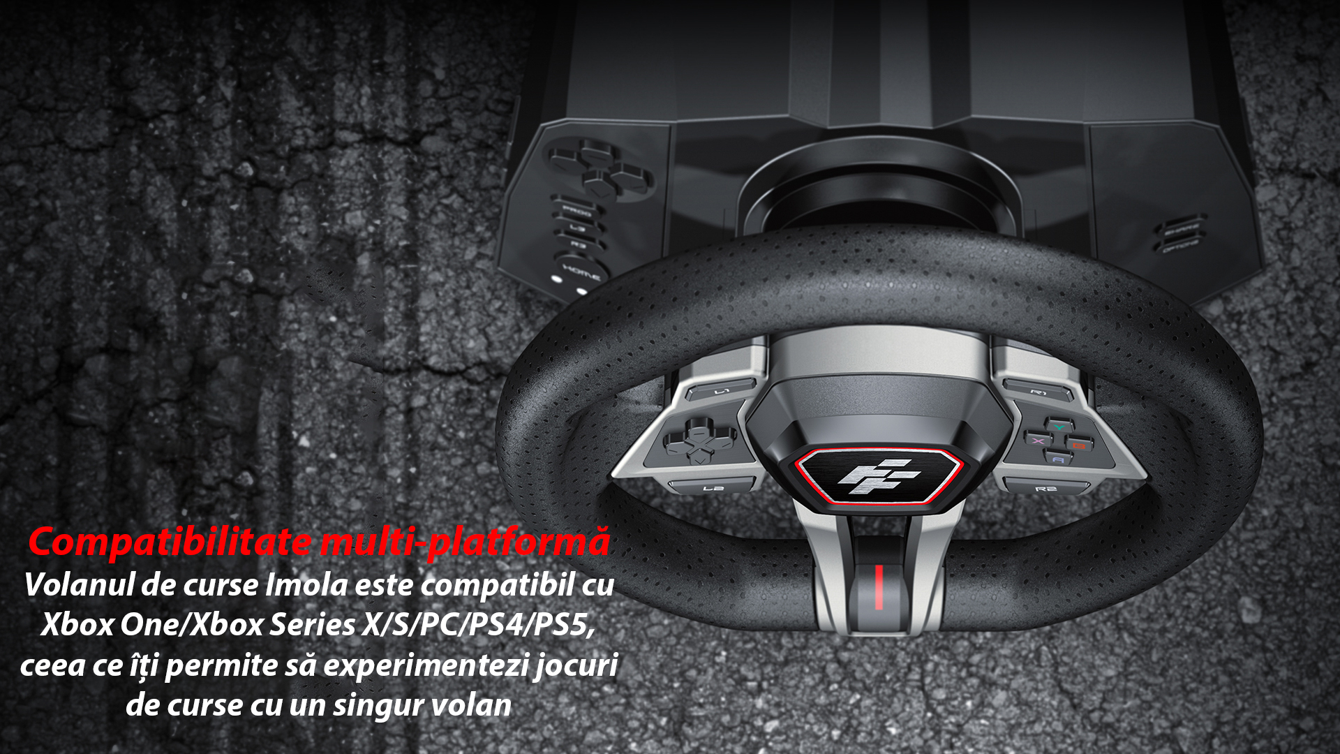 Volan Gaming FlashFire Imola negru cu rosu, rotire: 900°, revenire automata la centru, marja de eroare volan: 0.05°, diametru volan: 10 inch, 8-way D-pad, 2 padele, X-input/D-input mode, doua motoare pentru vibratii, schimbator cu 6 trepte si marsarier, 22 butoane, posibilitate mapare butoane, 3 pedale, pedalele se pot plia pentru a usura depozitarea, compatibilitate: PS5/PS4 / PC / Xbox, prindere pe ventuze si menghine, 1x USB, lungime fir: 180cm, include converter volan Imola (F107) pentru PS5, conector USB, dimensiuni: 284x362x280mm, conector USB